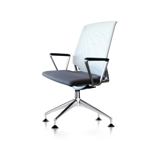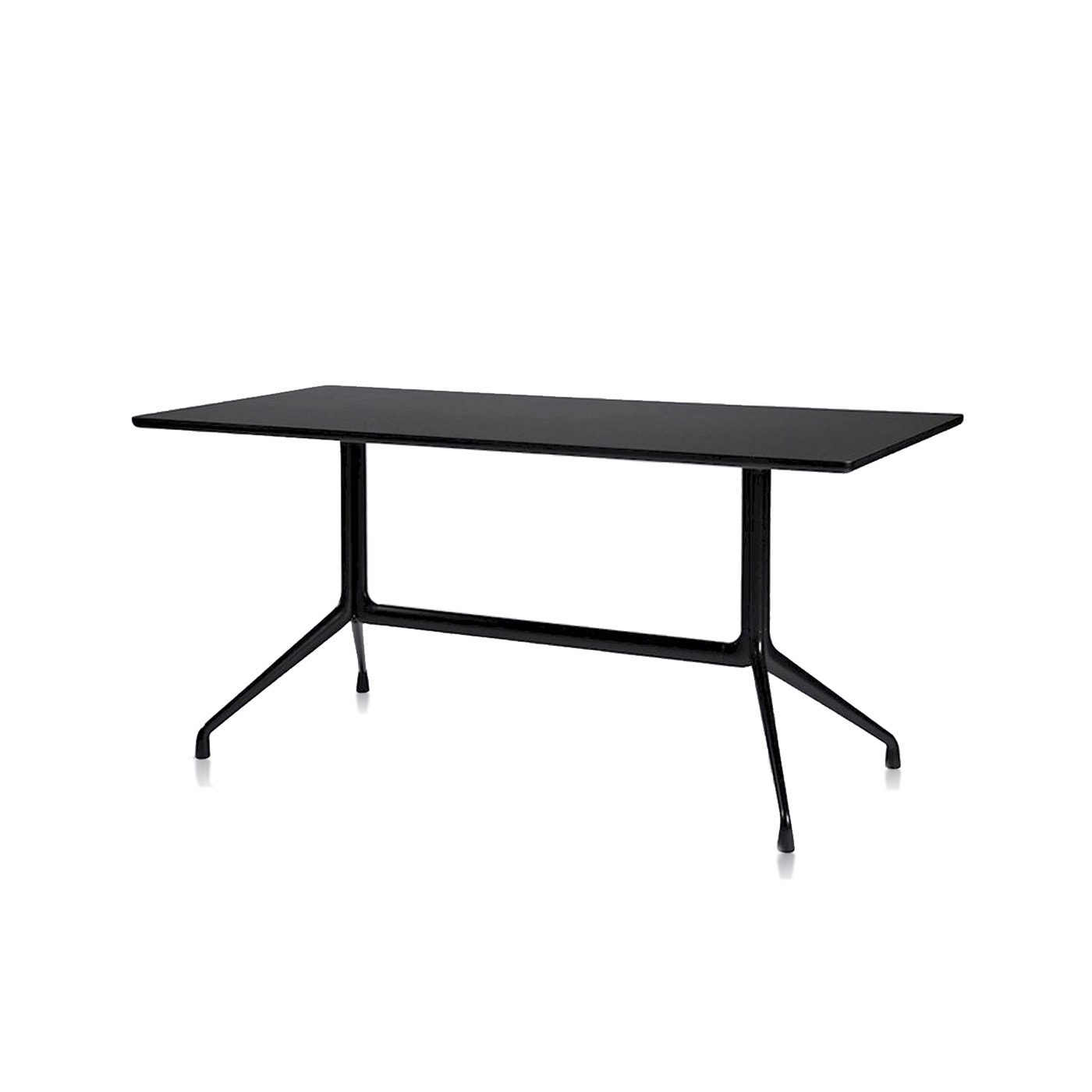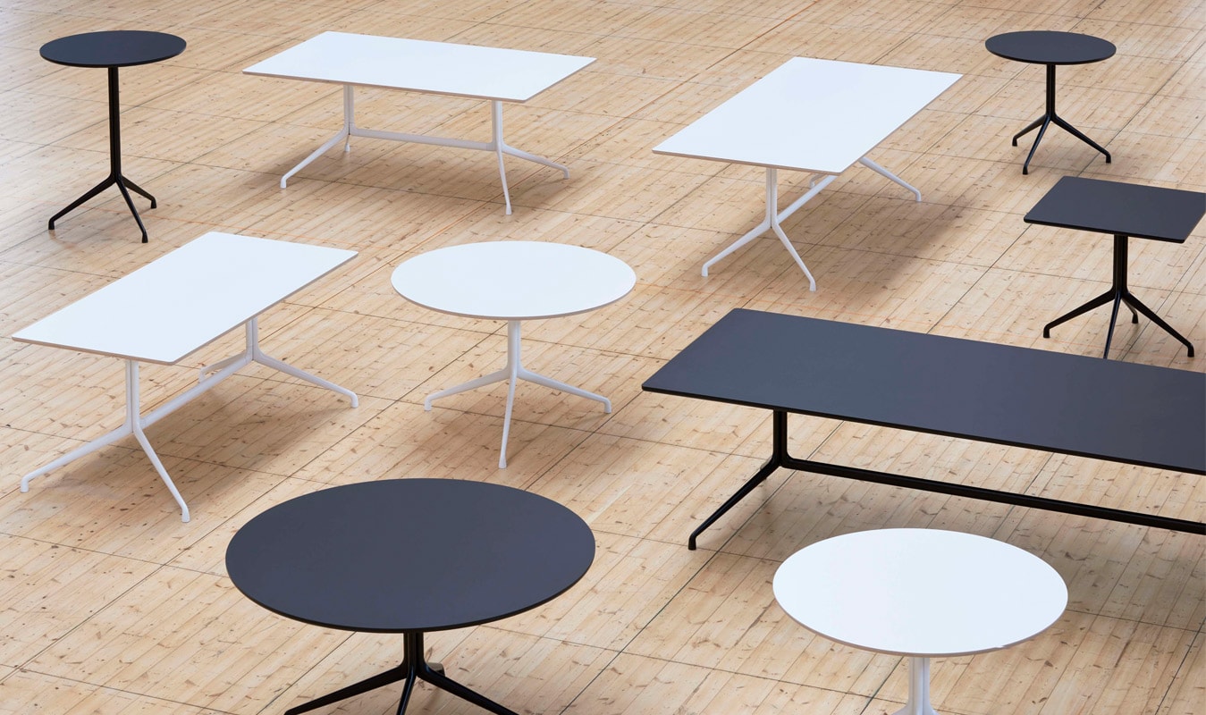 Il top in linoleum nero o laminato bianco è disponibile in più forme e dimensioni, sorretto da una struttura essenziale dai piedini alti, in alluminio verniciato.