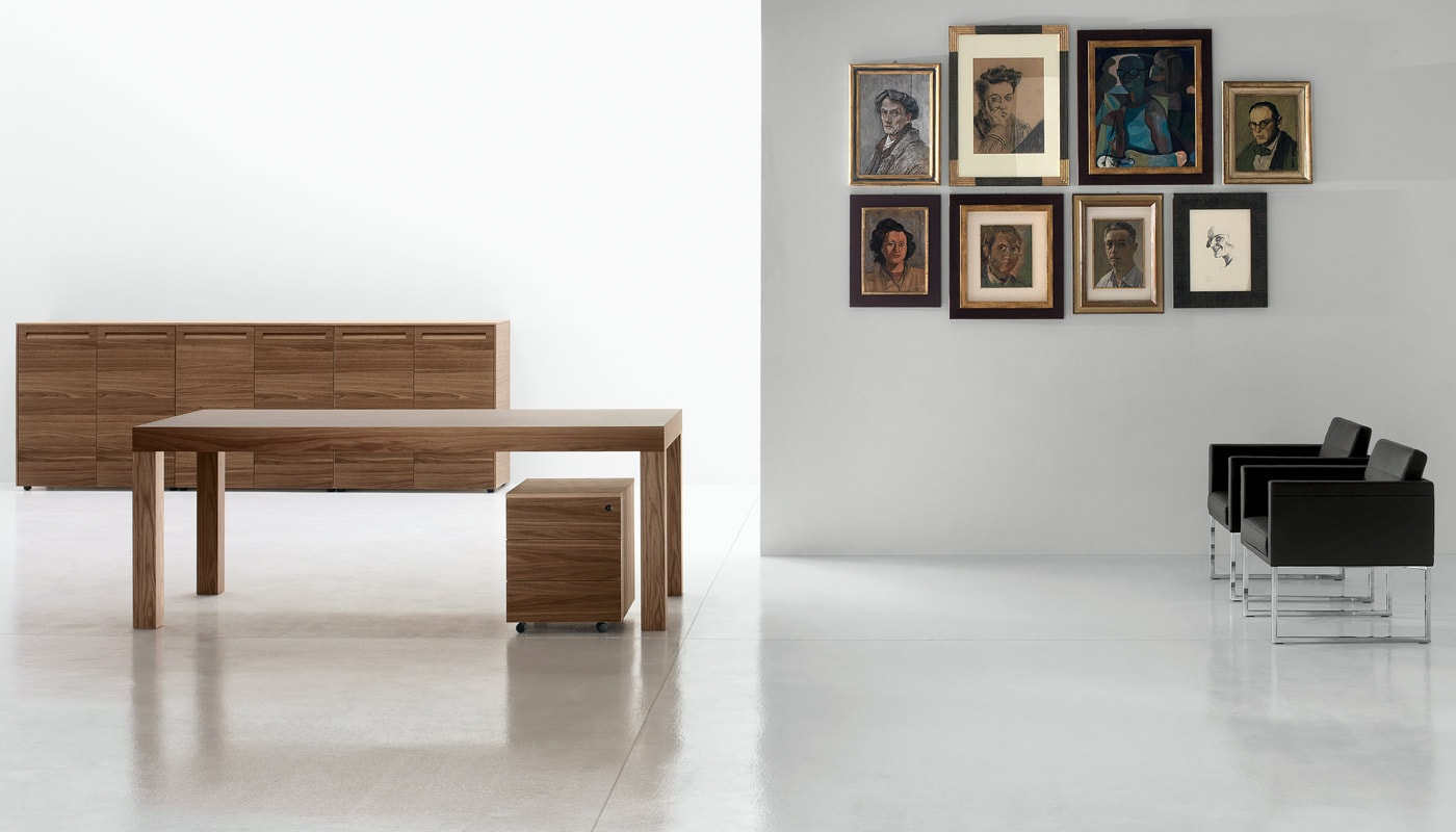Di grande presenza e forte impatto visivo, il tavolo direzionale Erasmo di Della Chiara cattura lo sguardo grazie ad un design solido e alla bellezza del legno.