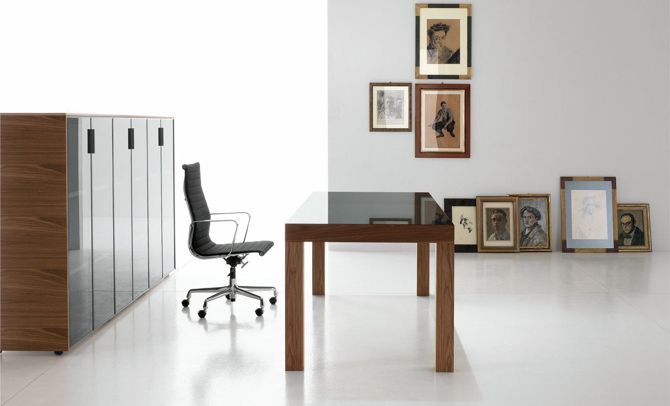 Tavolo di Della Chiara pensato per arredare l’ufficio direzionale e la sala riunioni, dal design di forte impatto visivo e materiali pregiati che caratterizzano l’ambiente ufficio con eleganza e originalità.
