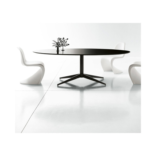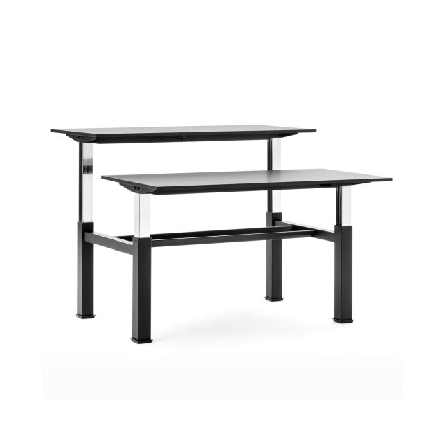 La postazione di lavoro Fit Bench di Della Chiara è costituita da due scrivanie unite da una solida struttura in metallo, entrambe dotate di un meccanismo di regolazione dell’altezza meccanico e silenzioso.