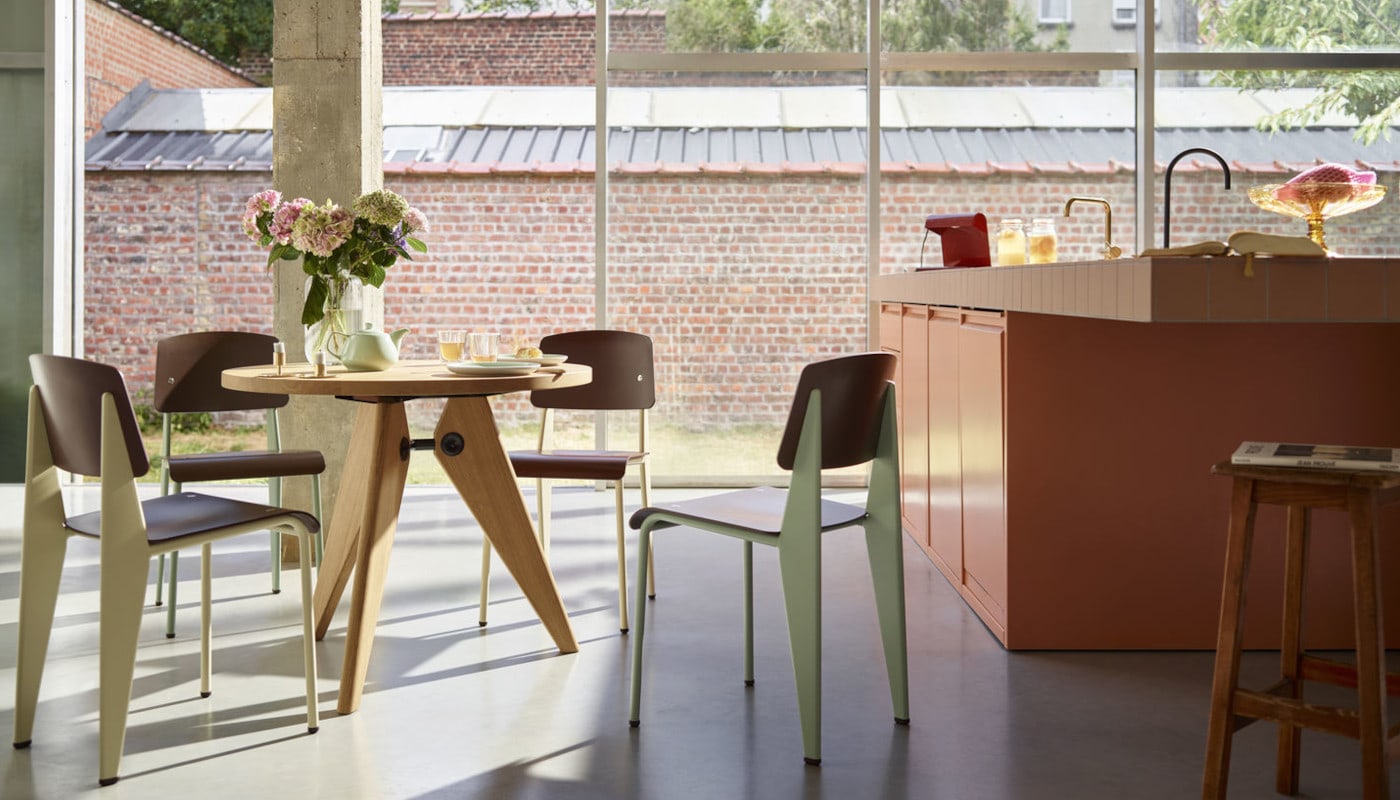 Gueridon tavolo, del brand Vitra, dal tono concreto e solido, porta l’impronta del pioniere del design industriale Jean Prouvé.
