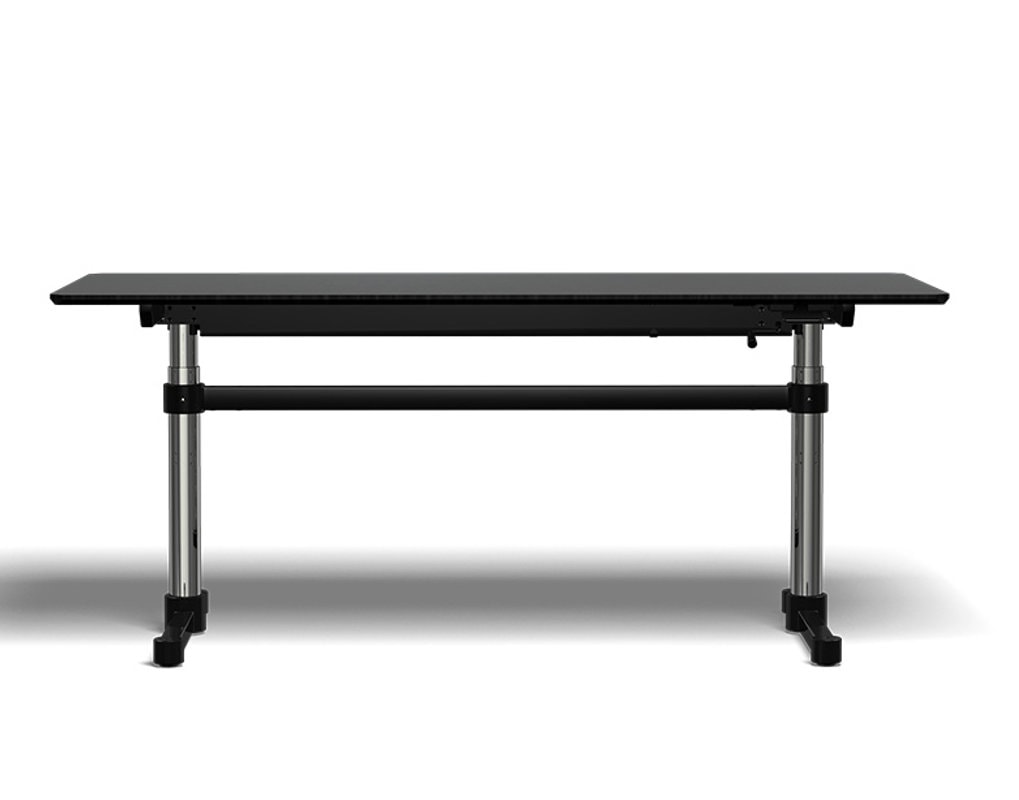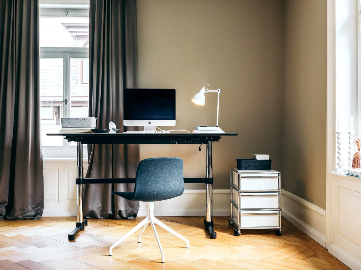 Il tavolo Kitos M regolabile in altezza, abbinato al mobile contenitore Haller in acciaio, sono la combinazione ideale per allestire uno spazio di lavoro funzionale e sofisticato.