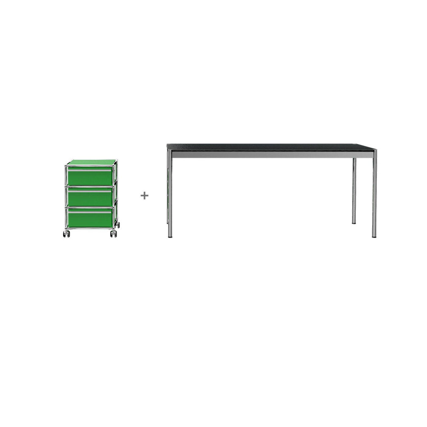 Combinazione: tavolo Haller, finitura linoleum nero + scaffale, colore a scelta.