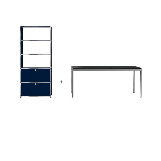 Per il tuo home office il brand svizzero USM, il cui segno distintivo è la purezza delle linee e la funzionalità degli arredi, propone l’ampio tavolo di lavoro USM Haller – misure cm 150 x 75 – con piano in nero linoleum, abbinato allo scaffale della serie Haller, capiente ed elegante, alto 179 cm e largo 75 cm, con vani a giorno e due ante a ribalta, disponibile in diverse colorazioni.