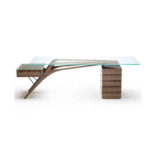 La scrivania, corredata da una cassettiera in legno verniciato, con il piano in cristallo e la struttura cromata lucida è un singolare esempio di semplicità ed equilibrio.