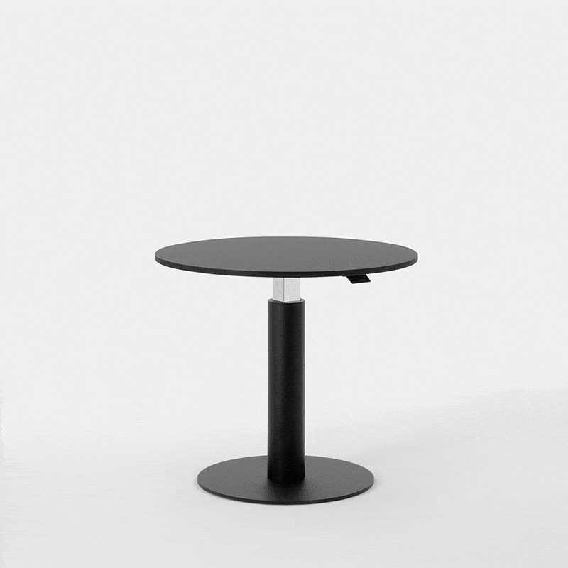 Il suo piano rotondo, regolabile in altezza tramite un sistema meccanico silenzioso e privo di alimentazione elettrica, si adatta con facilità alle diverse esigenze.