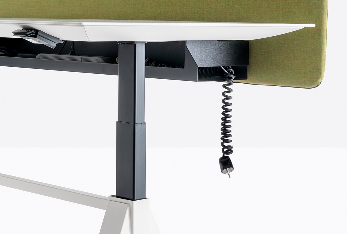 Arki-Table racchiude in sè una funzionalità intelligente: la regolazione elettrica in altezza consente di avere una postazione sempre su misura, le canaline integrate garantiscono una gestione ordinata dei cavi e il design modulare e versatile si adatta con facilità a contesti diversi.