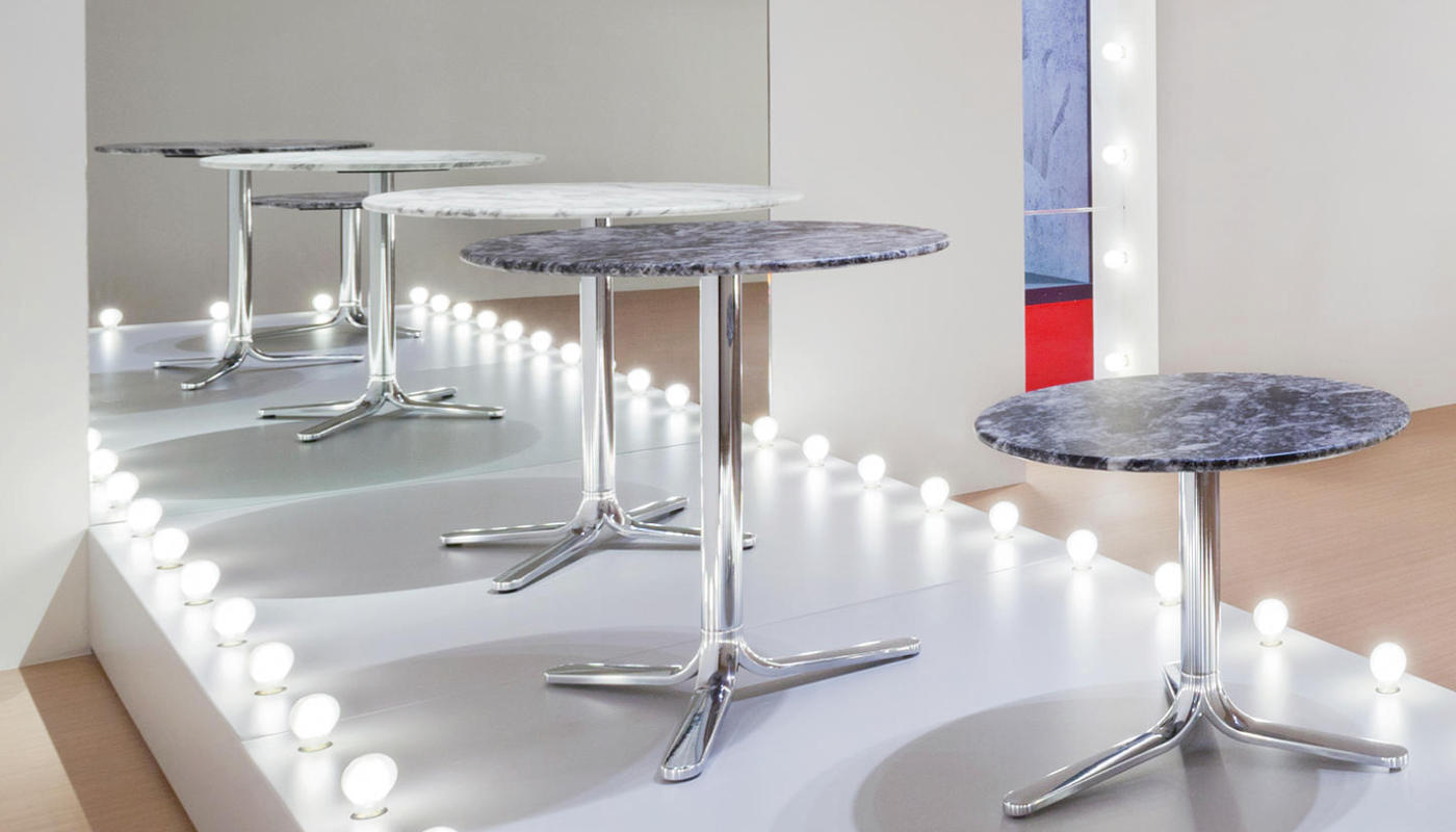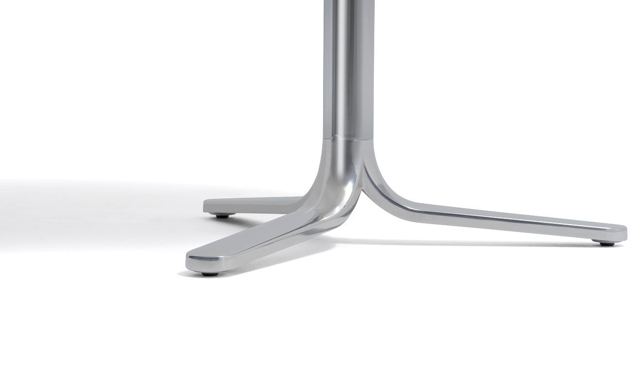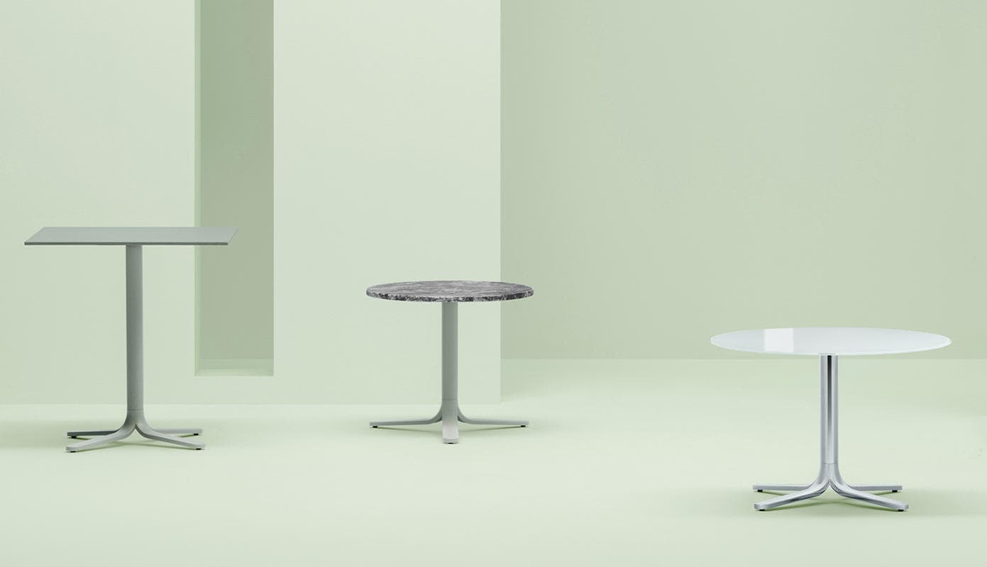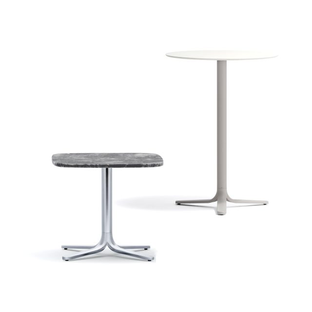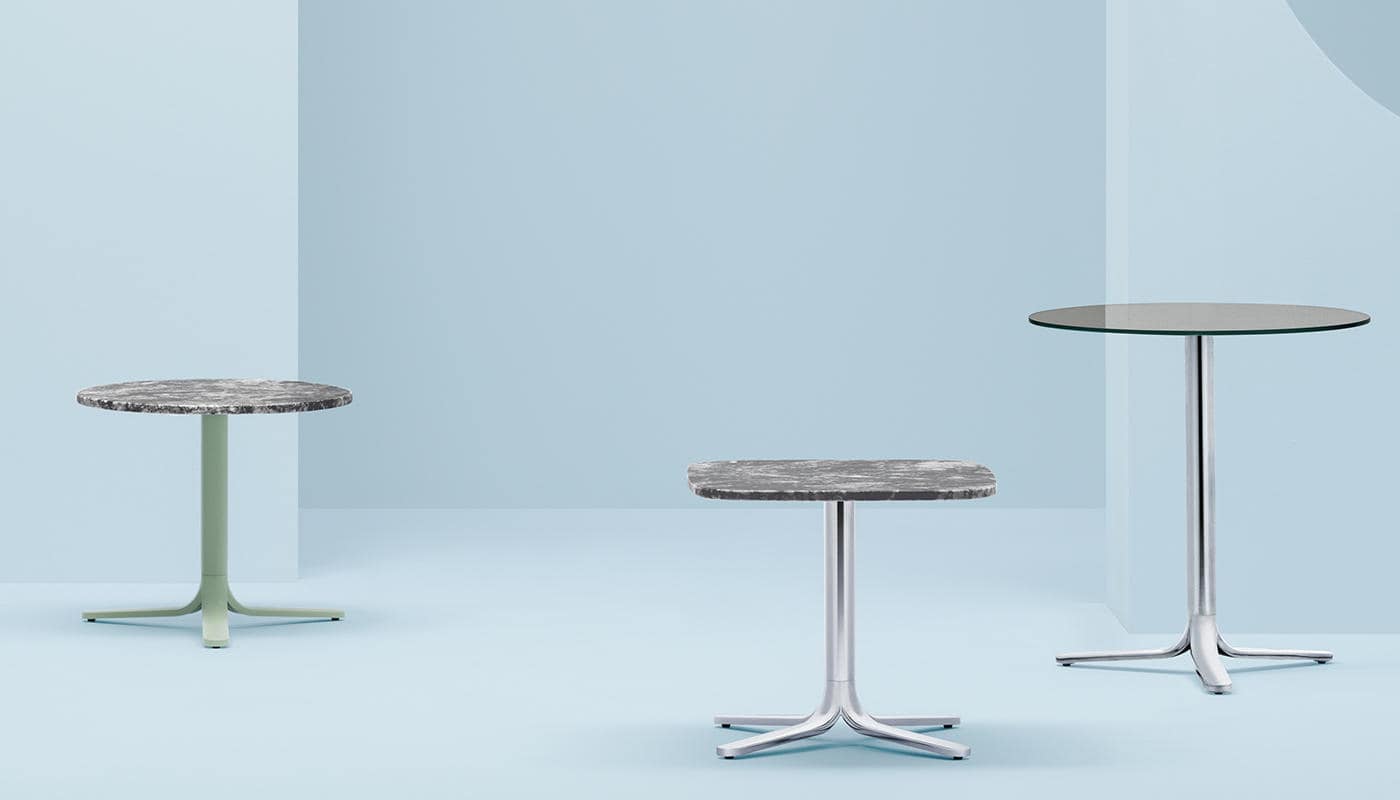 Disponibile in tre altezze e con un’ampia gamma di piani – rotondi o quadrati, in diversi spessori e finiture – Fluxo consente infinite combinazioni: top in laminato Fenix effetto marmo, stratificato, agglomerato di marmo o con dettagli bordati in ottone, da abbinare a basi a nastro a 3 o 4 razze in alluminio pressofuso con finitura lucida, ottone anticato, titanio o verniciata per esterni.
