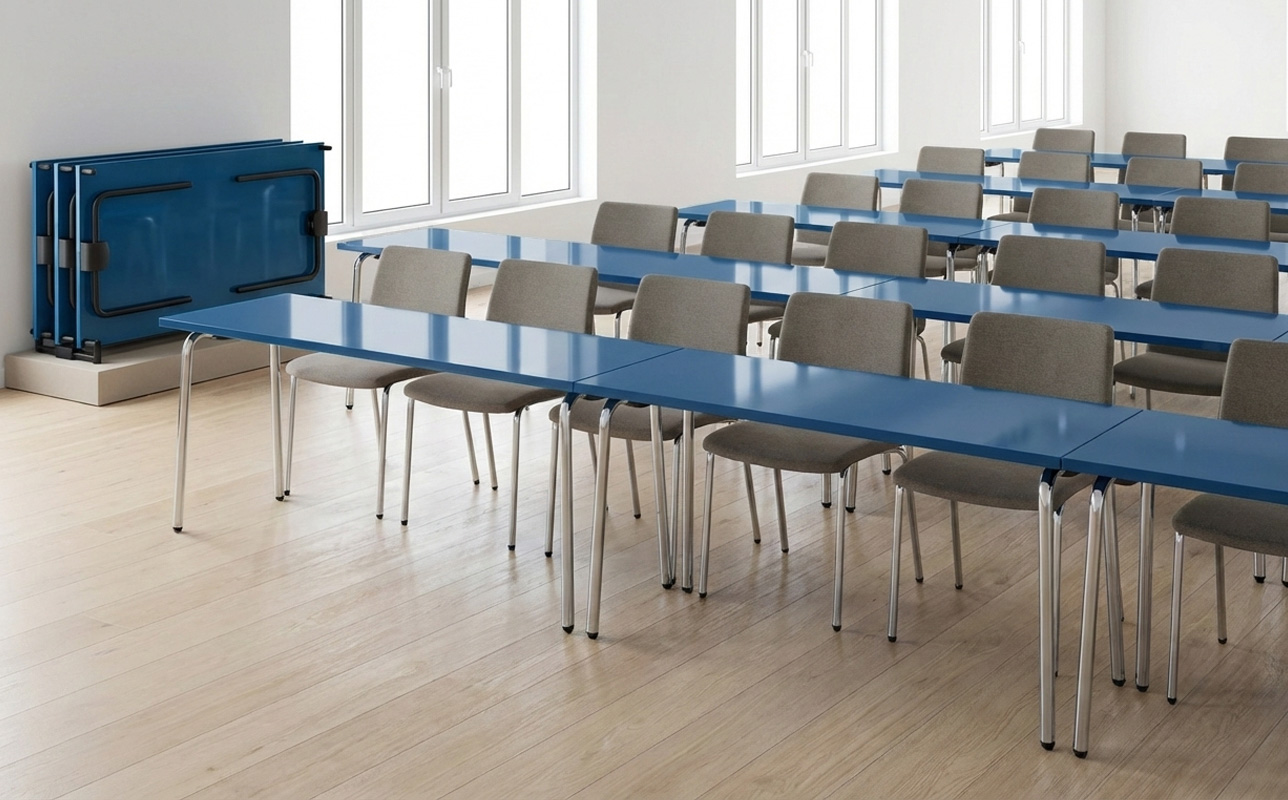 Il tavolo KIT 3050 con gambe pieghevoli di Della Chiara fa della funzionalità il suo punto di forza, rappresentando la soluzione ideale per spazi collettivi dinamici che richiedono la massima versatilità d’uso.