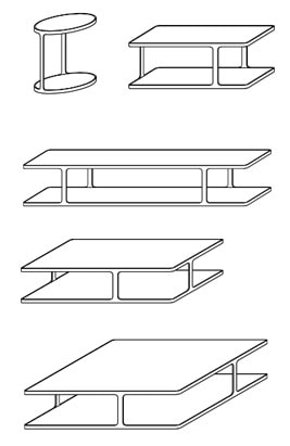 Gli arredi, di diverse forme e dimensioni, sono caratterizzati da due ripiani paralleli, in marmo, essenza, legno laccato o vetro, sostenuti da una struttura di metallo spazzolato.