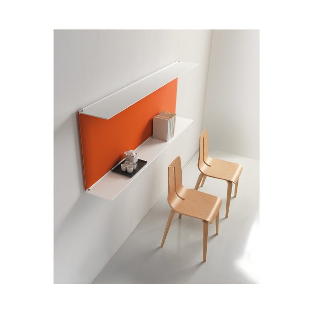 Il pannello va applicato a parete e fa da fondale alle sue sottili mensole d’acciaio, due per modulo, che vengono fissate direttamente al muro.