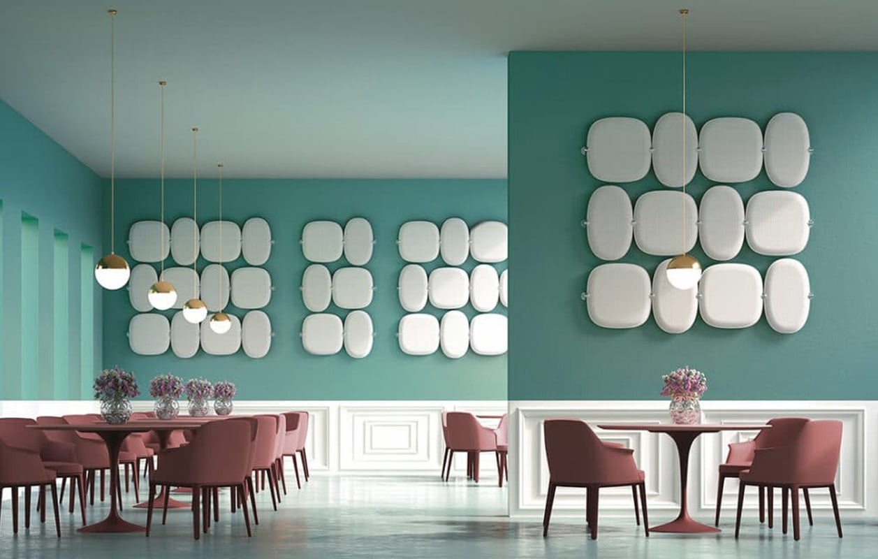 Proposti in quattro diverse dimensioni ed in quattro delicate colorazioni, i moduli fonoassorbenti parete-soffitto possono essere utilizzati singolarmente oppure combinati tra loro per realizzare soluzioni personalizzate e al contempo migliorare il comfort acustico.