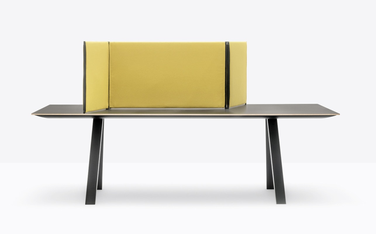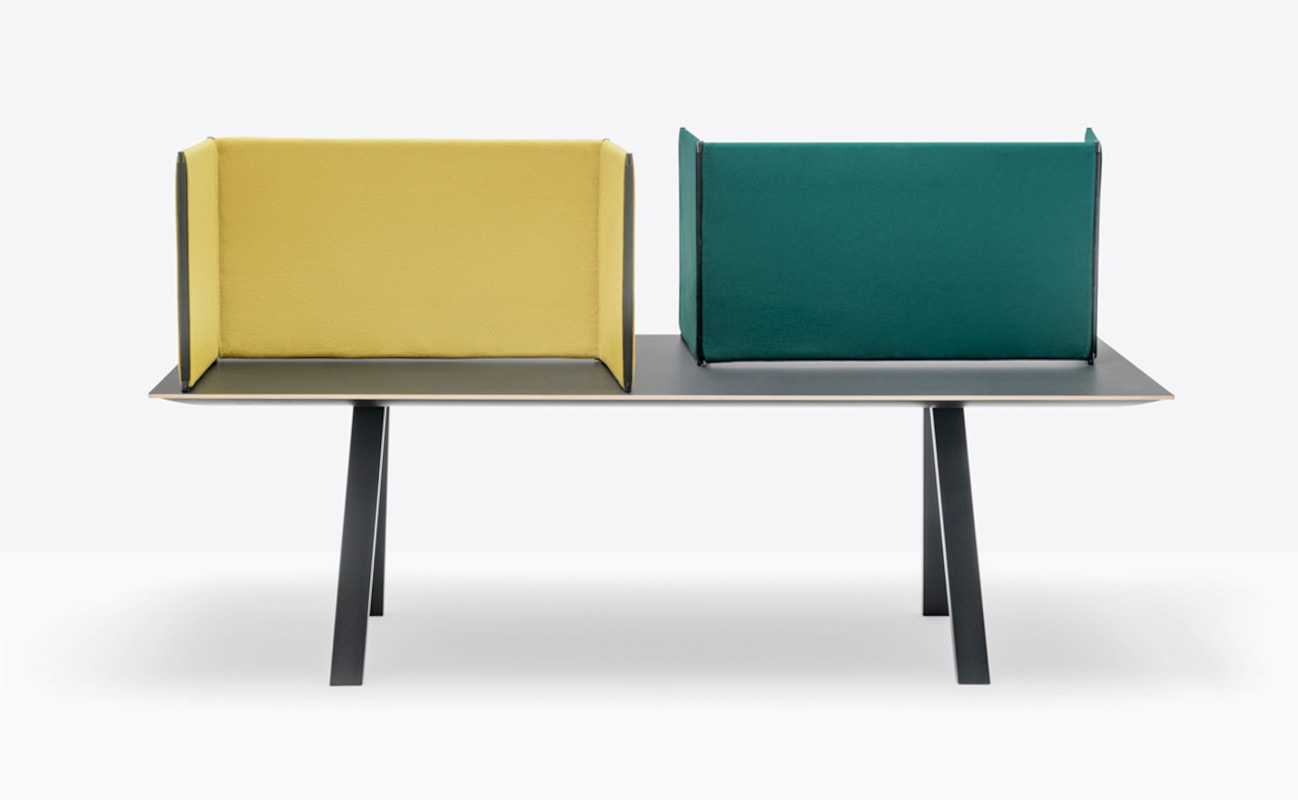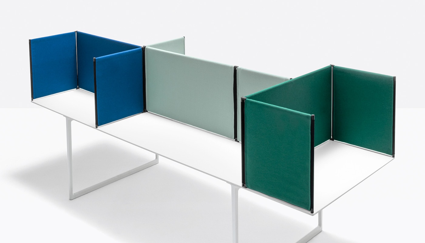 Il pannello divisorio fonoassorbente da tavolo Toa Folding Screen, disegnato da Robin Rizzini per Pedrali, è realizzato con struttura in metallo e rivestimento in tessuto ignifugo completamente sfoderabile e lavabile.