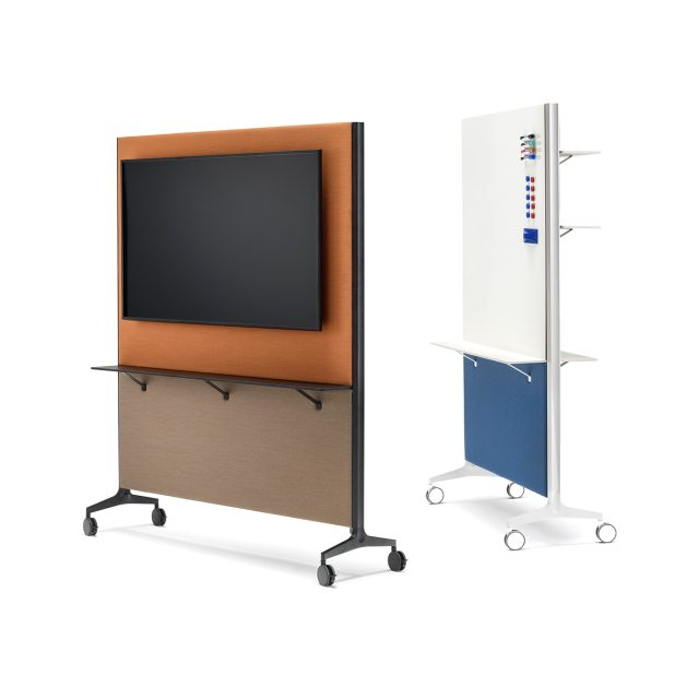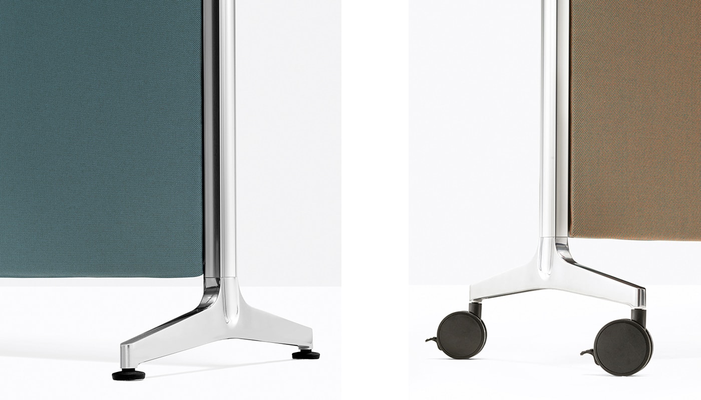 Ypsilon Connect migliora il comfort acustico grazie ai pannelli fonoassorbenti sostenuti dalla struttura in alluminio, free standing, con base su ruote o con piedini.