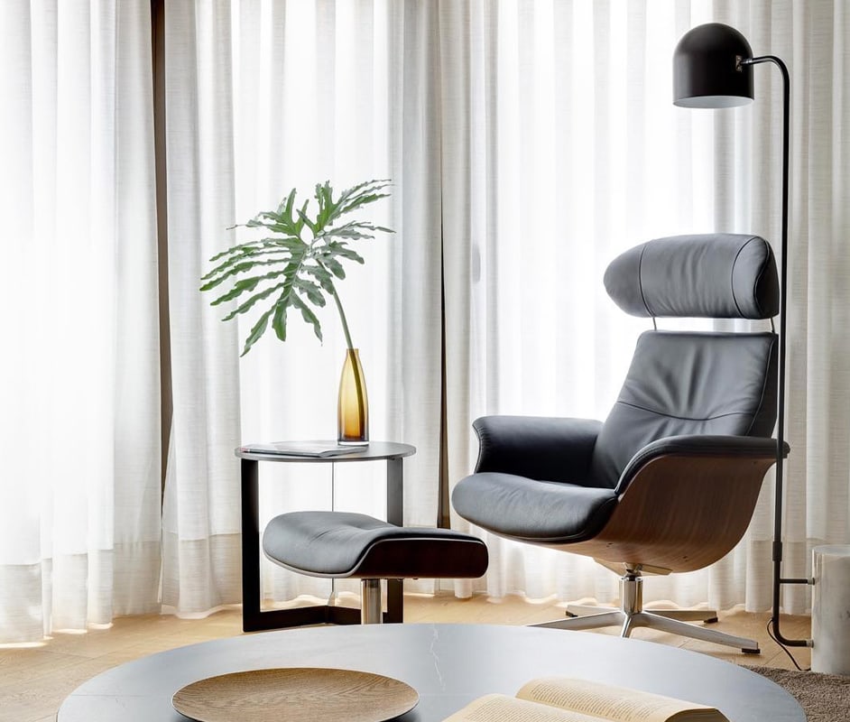 Luca, lampada da terra di Aromas del Campo, aggancia il suo stelo in metallo verniciato nero alla solida base in marmo di Carrara.