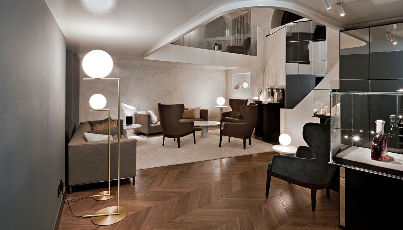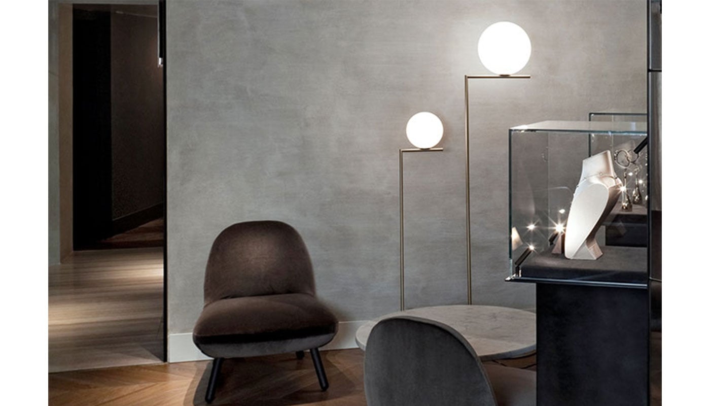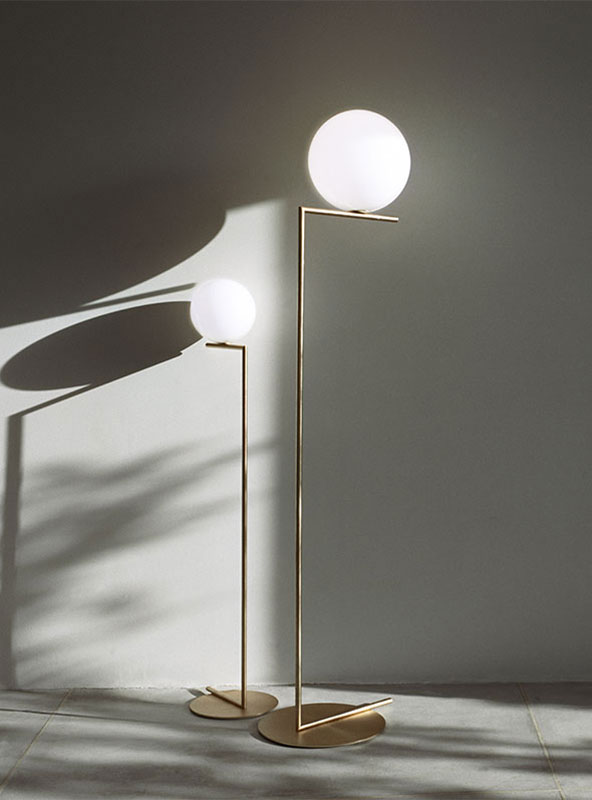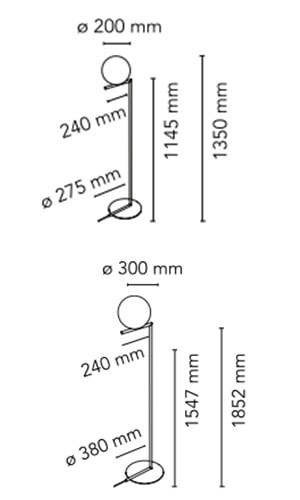 IC Light Floor di Flos è disponibile nelle varianti F1 ed F2, diverse nell’altezza dello stelo, nell’ampiezza della base e nel diametro del diffusore a sfera.