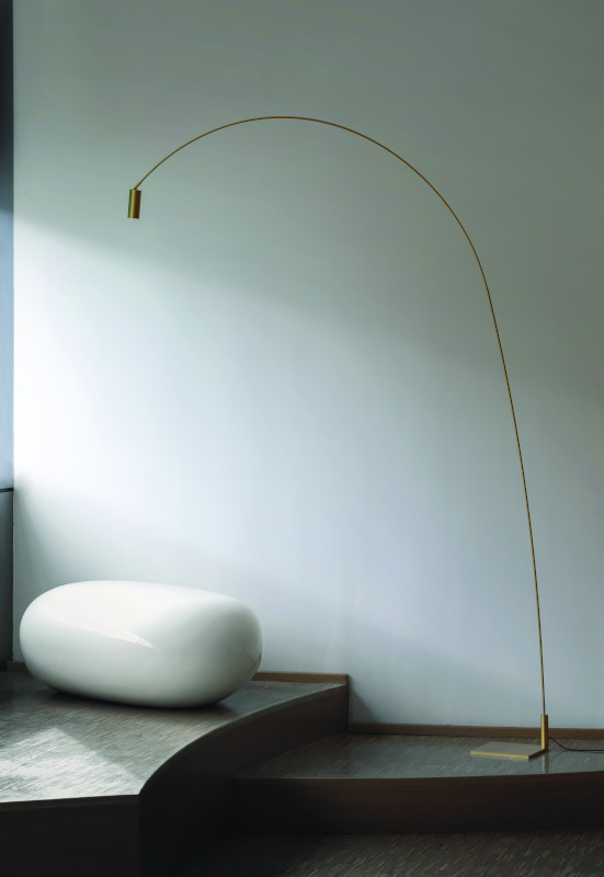L’ampio arco disegnato dal braccio in acciaio termina con uno spot cilindrico di piccole dimensioni che diffonde un fascio di luce dimmerabile diretta. A scelta può essere applicato un filtro anti-abbagliamento in dotazione.