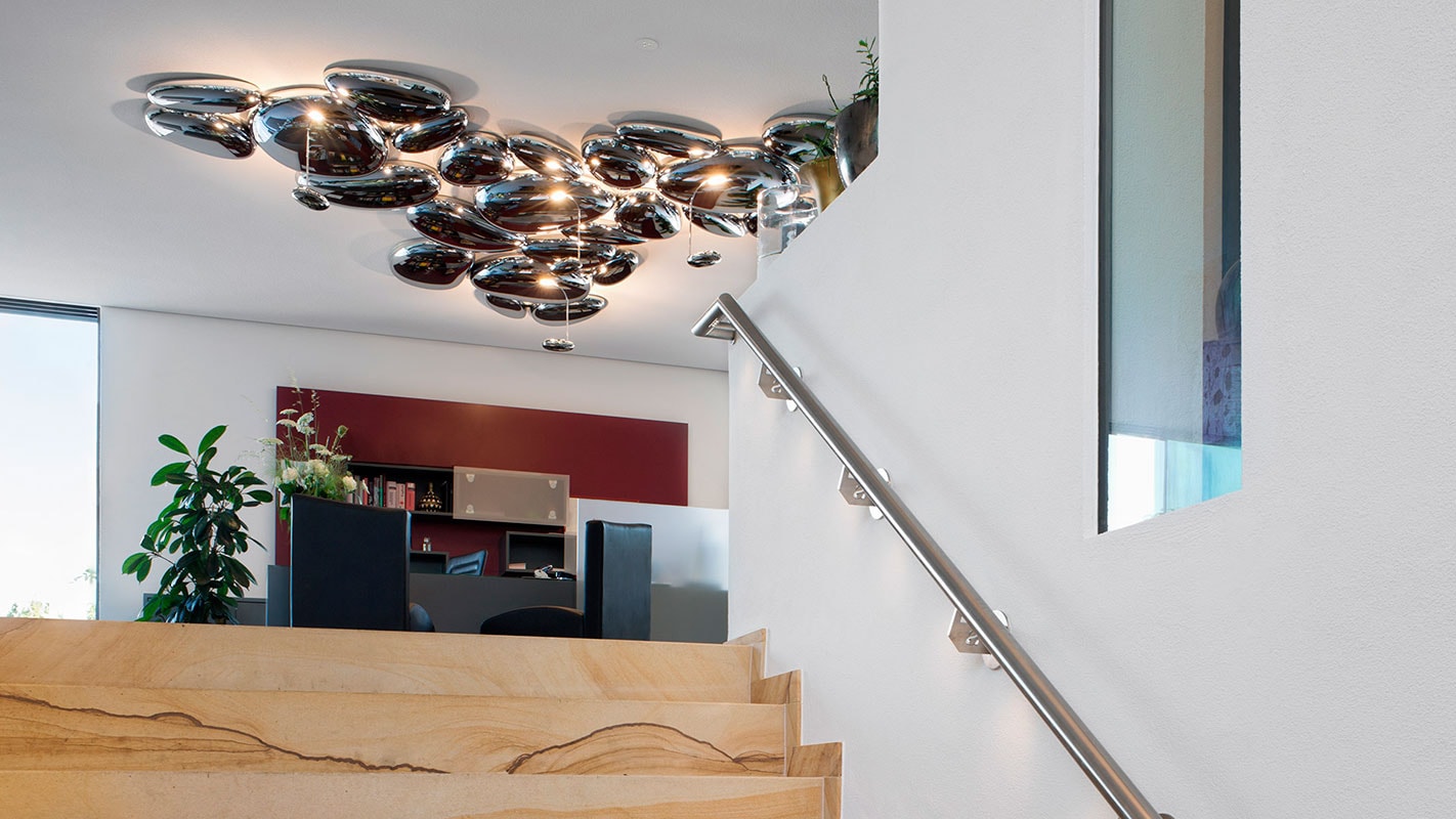 Sei corpi globulari in finitura metallizzata, riflettono la luce di una lampada – sia alogena che a Led – posizionata al di sotto di essi nella versione elettrificata o quella di un proiettore a parete completamente indipendente nella variante non elettrificata.