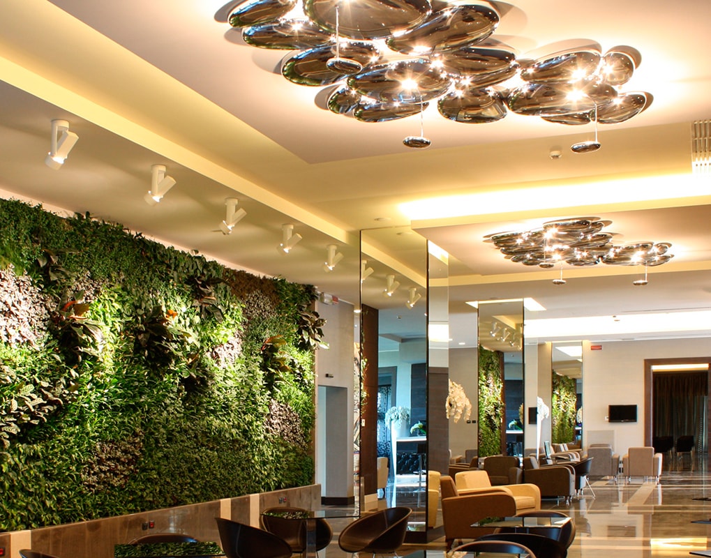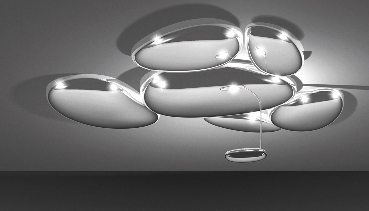 Skydro, disegnata per Artemide da Ross Lovegrove, è una lampada a parete o soffitto basata sul riflesso, una composizione di forme naturalistiche e globulari che, a seconda della variante scelta, restituisce la luce di una fonte integrata o di una sorgente esterna a parete.