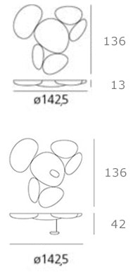 Skydro è disponibile in due versioni: la prima, in cui la luce indiretta proviene da un corpo luminoso integrato nella lampada; la seconda, in cui la luce diretta proviene da un proiettore staccato dalla lampada.