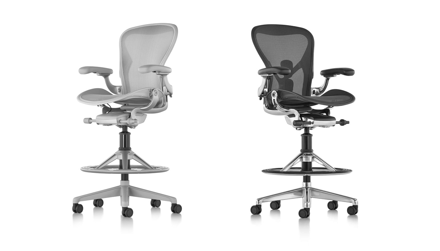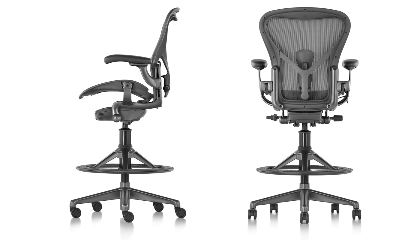 Il design e la tecnologia Aeron al servizio di una seduta alta, uno sgabello creato appositamente per le postazioni sit-stand, dotato di uno straordinario poggiapiedi, ampio, mobile e provvisto di finitura antiscivolo.