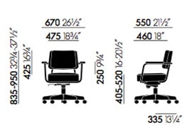 La poltrona su base a cinque razze con ruote, ha la seduta girevole e regolabile in altezza ed è fornita di un meccanismo che permette l’inclinazione in base al peso dell’utilizzatore.