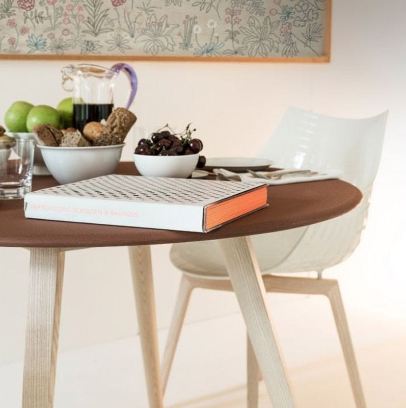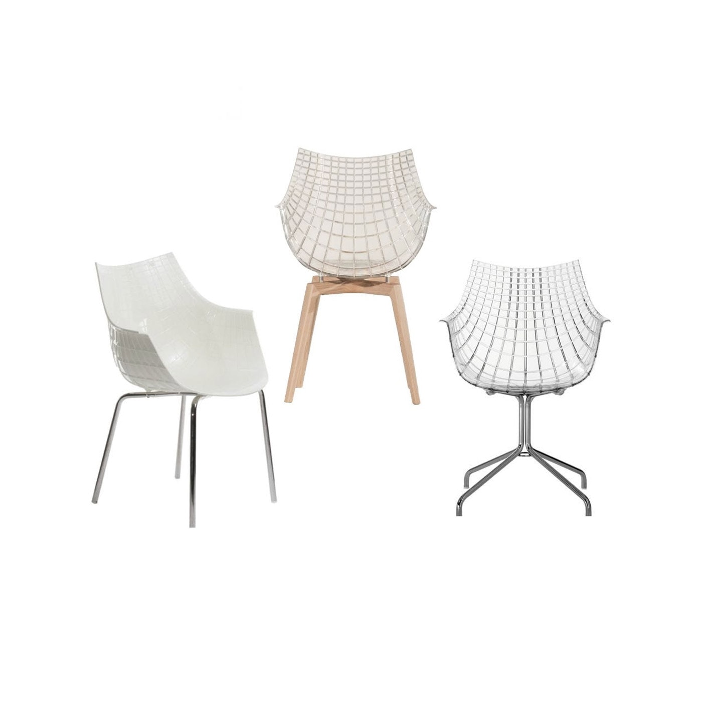 Meridiana di Driade è realizzata nelle varianti: sedia a 4 gambe, poltroncina su 4 razze, sgabello girevole basso e alto.