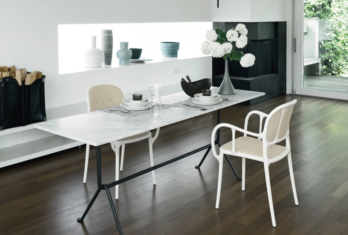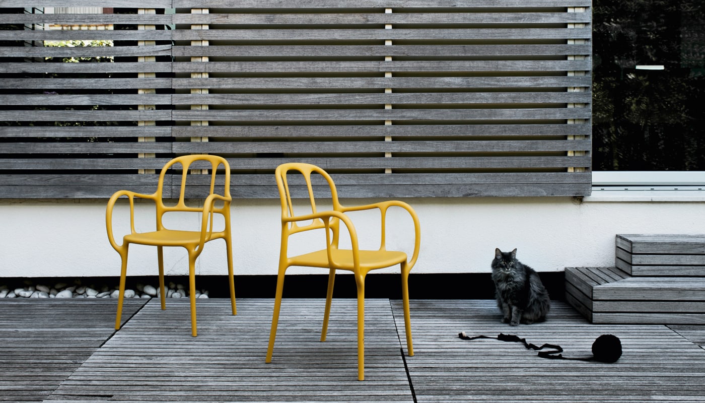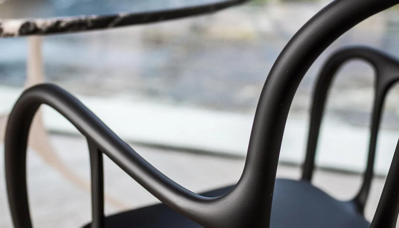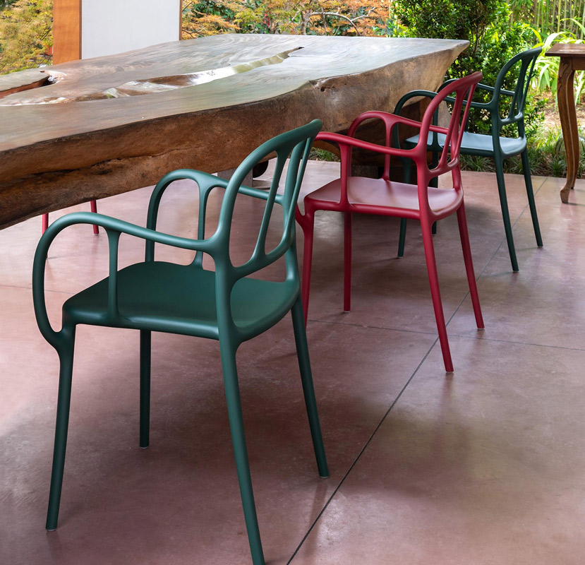 Linee suadenti e ariose per questa sedia impilabile ideata da Jaime Hayón e realizzata da Magis.