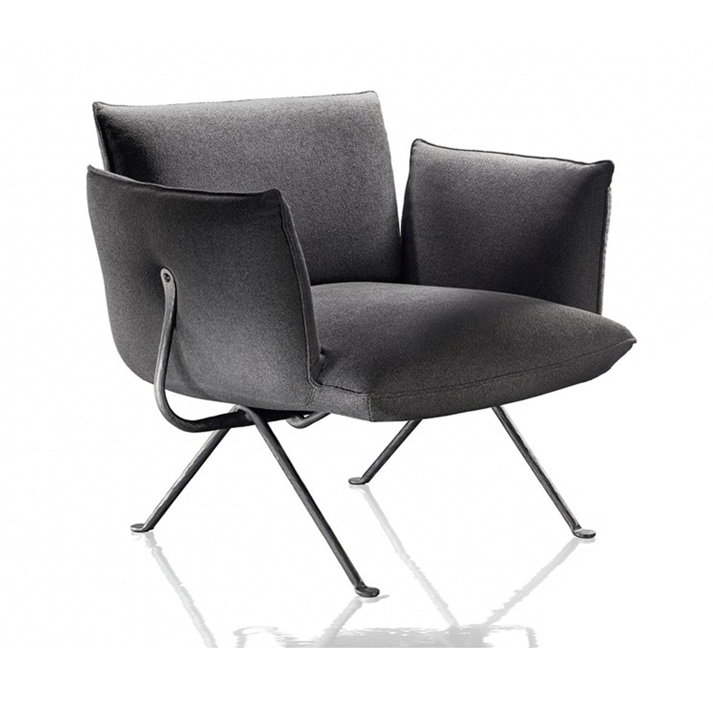 Il ferro battuto che caratterizza la poltrona Officina di Magis, progettata come tutta la collezione “Officina” da Ronan & Erwan Bouroullec, è reso morbido ed accogliente dalla soffice seduta imbottita, rivestita in tessuto sfoderabile nei diversi colori della gamma Magis.