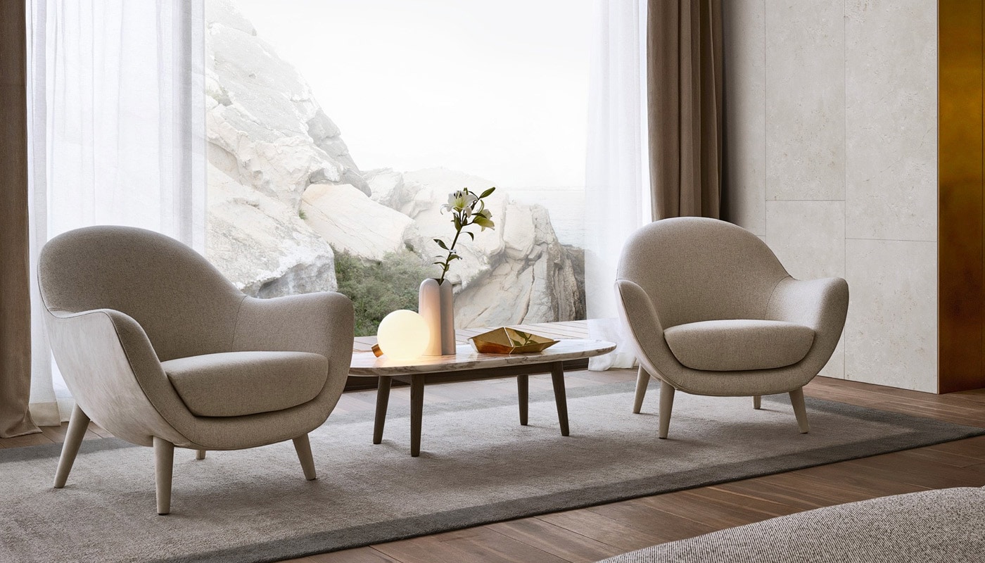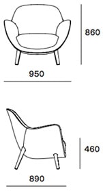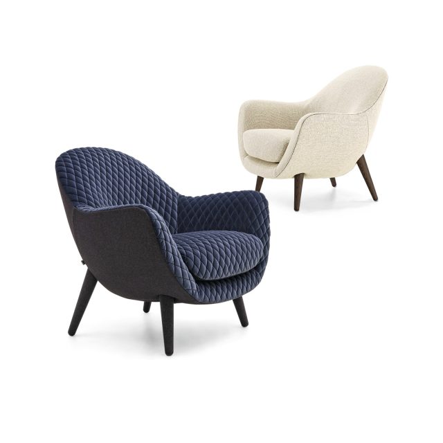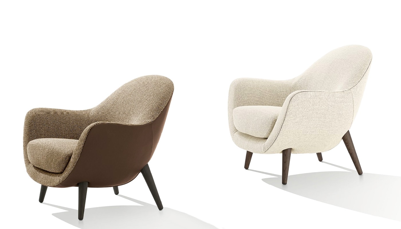 I suoi punti di forza sono i volumi confortevoli e l’elevata qualità del rivestimento, che può essere di finiture diverse tra interno della seduta ed esterno della scocca, e a scelta tra tessuto o pelle.