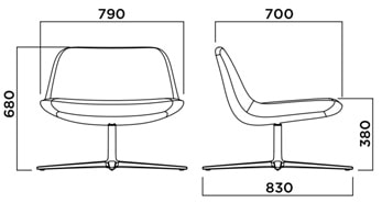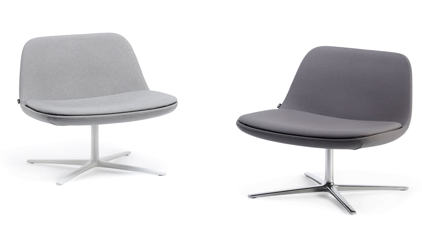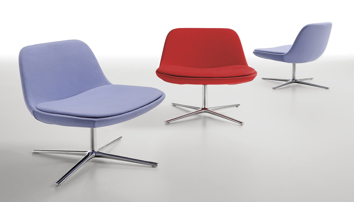 La seduta ampia e confortevole è rivestita in pelle, ecopelle o tessuto e poggia su una base a quattro razze in alluminio.