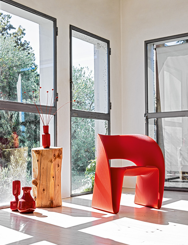 Scultorea nella postura, dinamica nelle linee esaltate dalla zigrinatura della parete esterna, la poltrona Raviolo di Magis ostenta con serena determinazione la propria originalità.