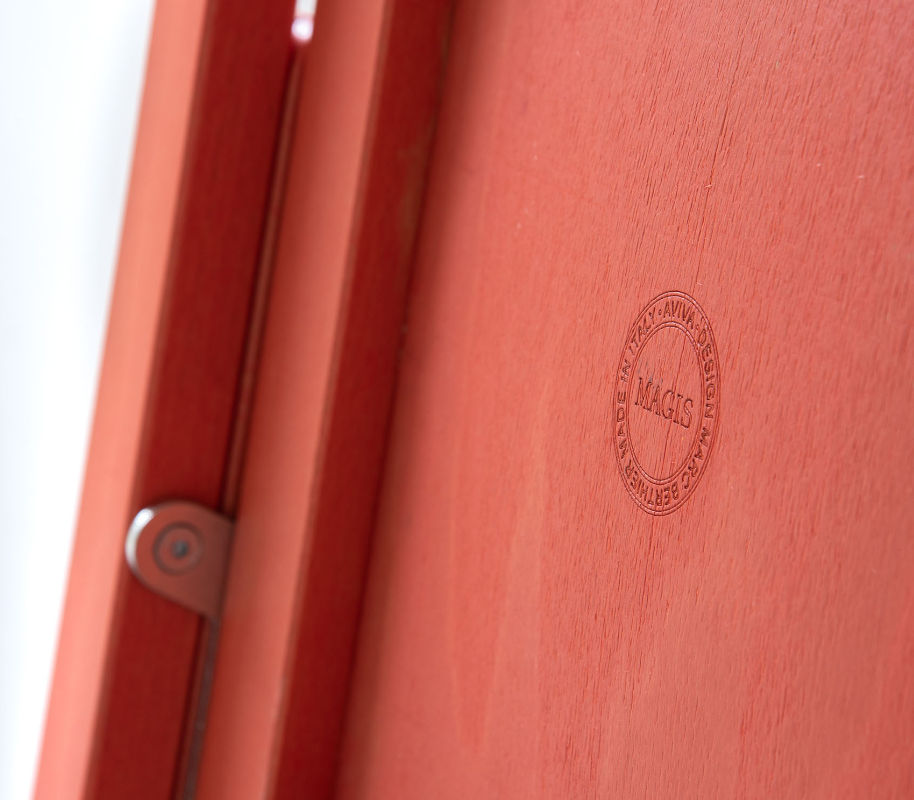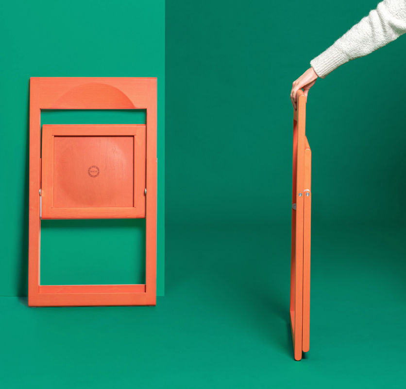 Le geometrie essenziali, definite e armoniose della sedia pieghevole Aviva di Magis, dialogano con una struttura compatta che, una volta piegata, occupa solo 5 cm di profondità.