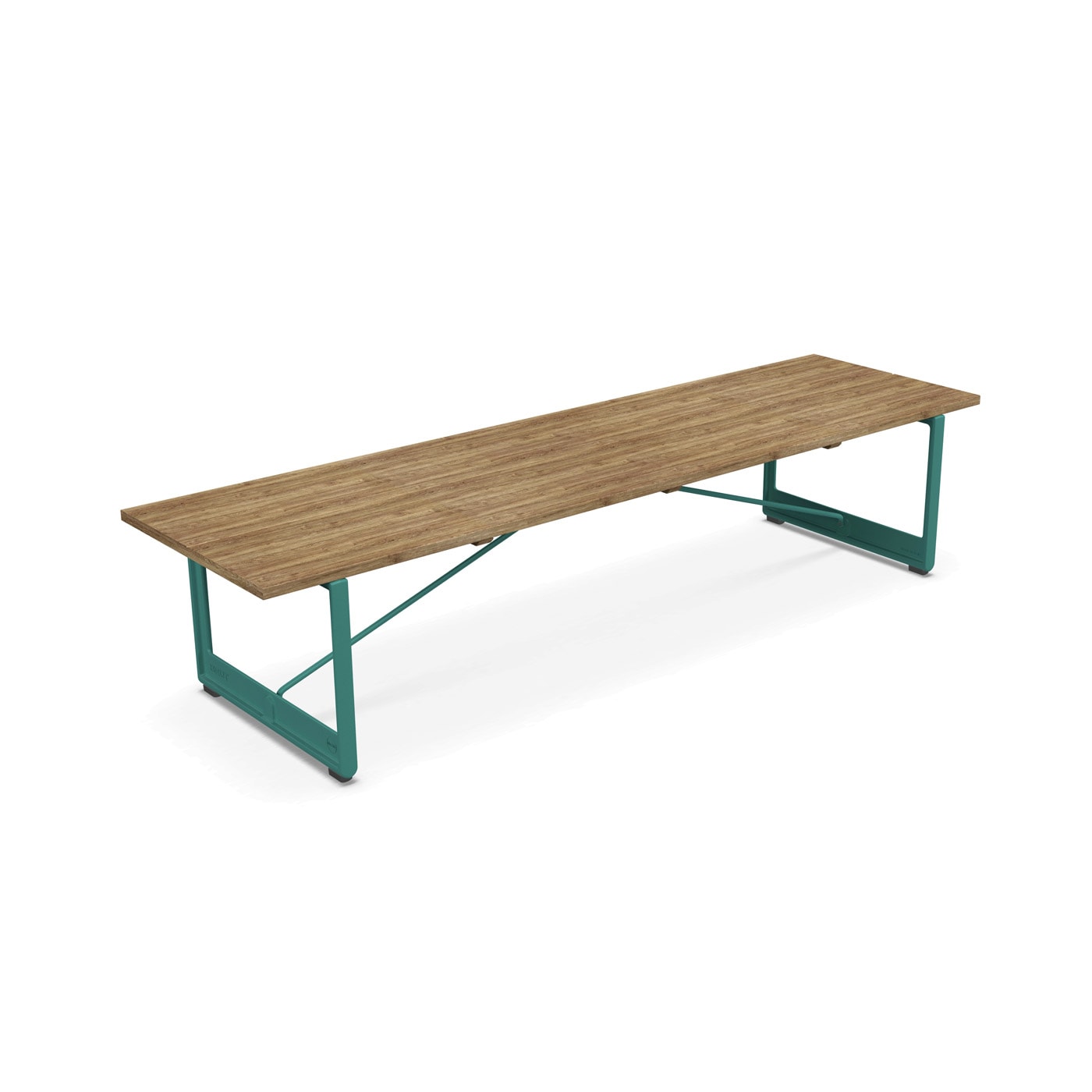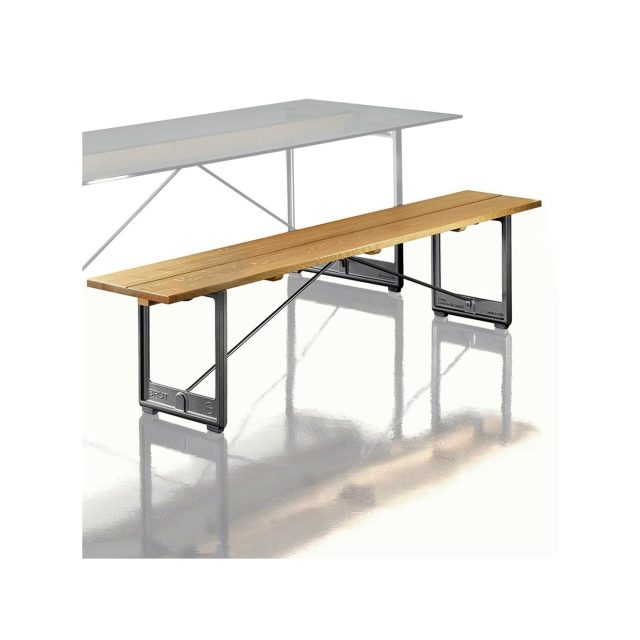 La base è formata da due supporti rettangolari in ghisa verniciata poliestere in diverse colorazioni che sorreggono la seduta in massello di rovere naturale ed è disponibile in due modelli della stessa lunghezza ma di diversa profondità.