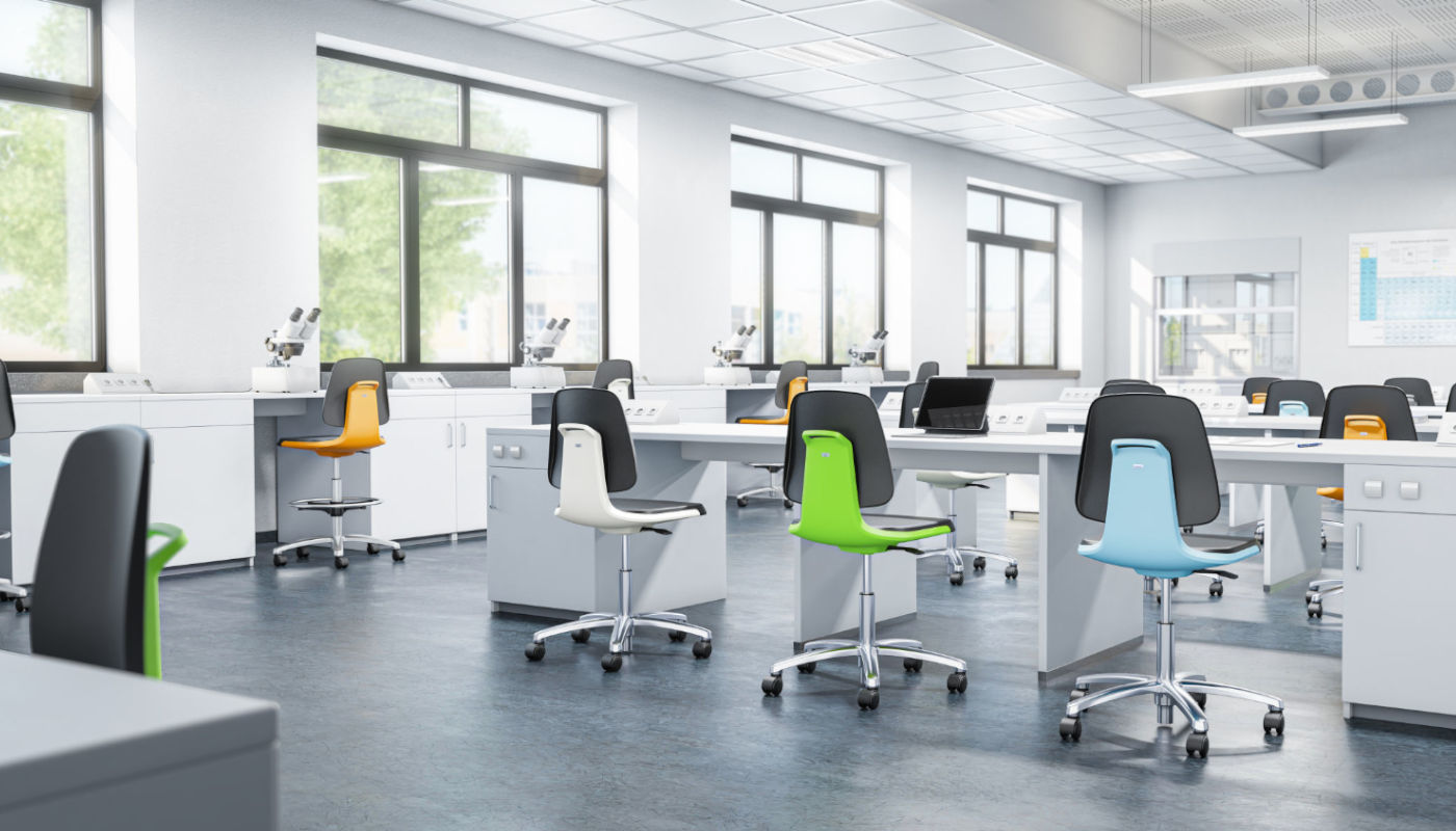 Tutto questo è insito nelle sedie Labsit del brand tedesco Bimos, studiate specificamente per laboratori, studi medici, ospedali.