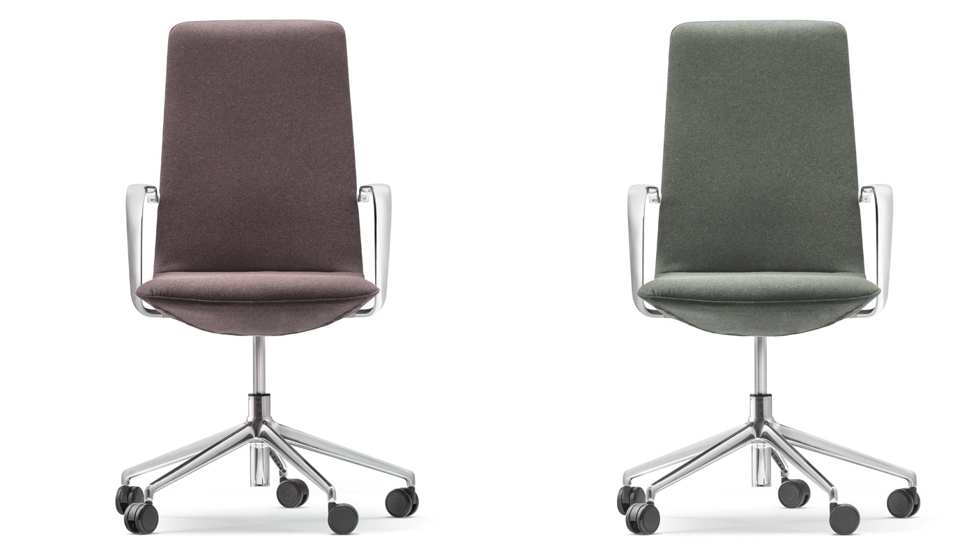Elle è disponibile anche con schienale basso, in versione sedia ospiti e riunione.