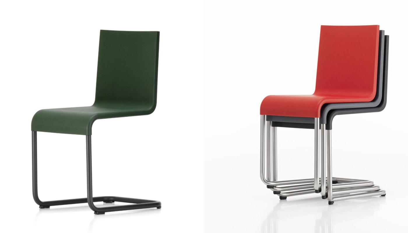 .05 sedia di Vitra, disegnata da Maarten Van Severen, ha un’estetica senza compromessi: una sedia cantilever dal design ultra-minimale dotata di una scocca flessibile con effetto imbottito.