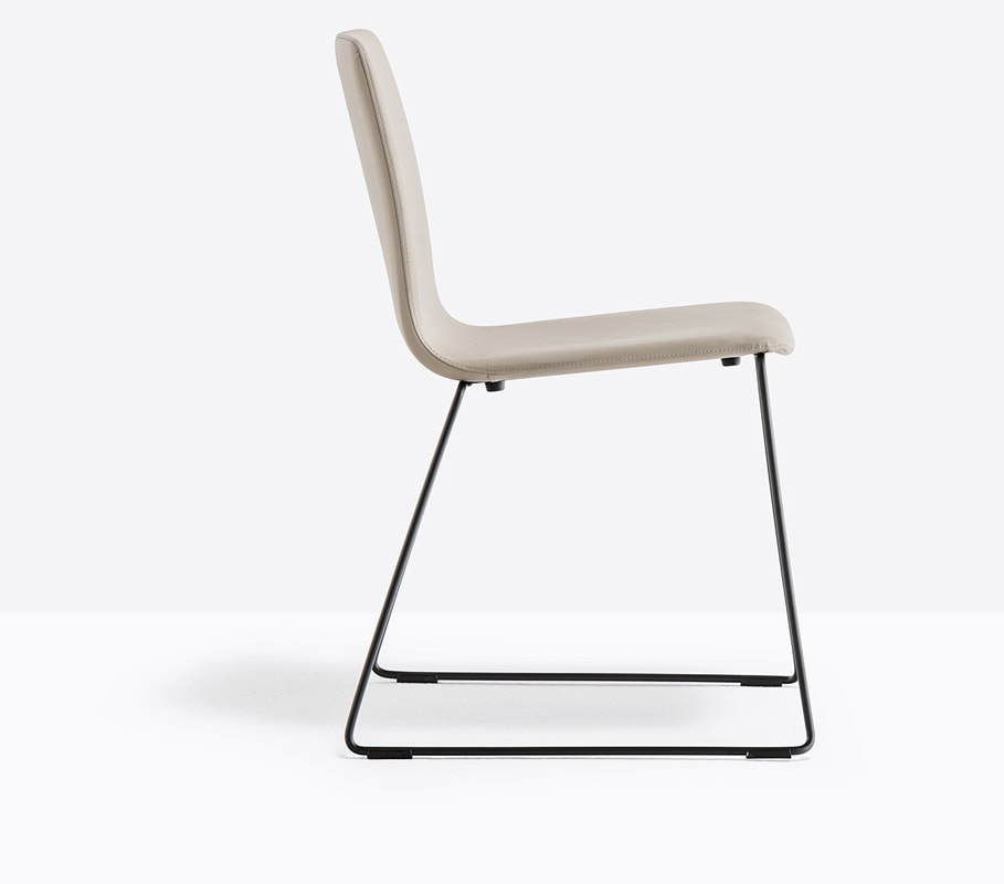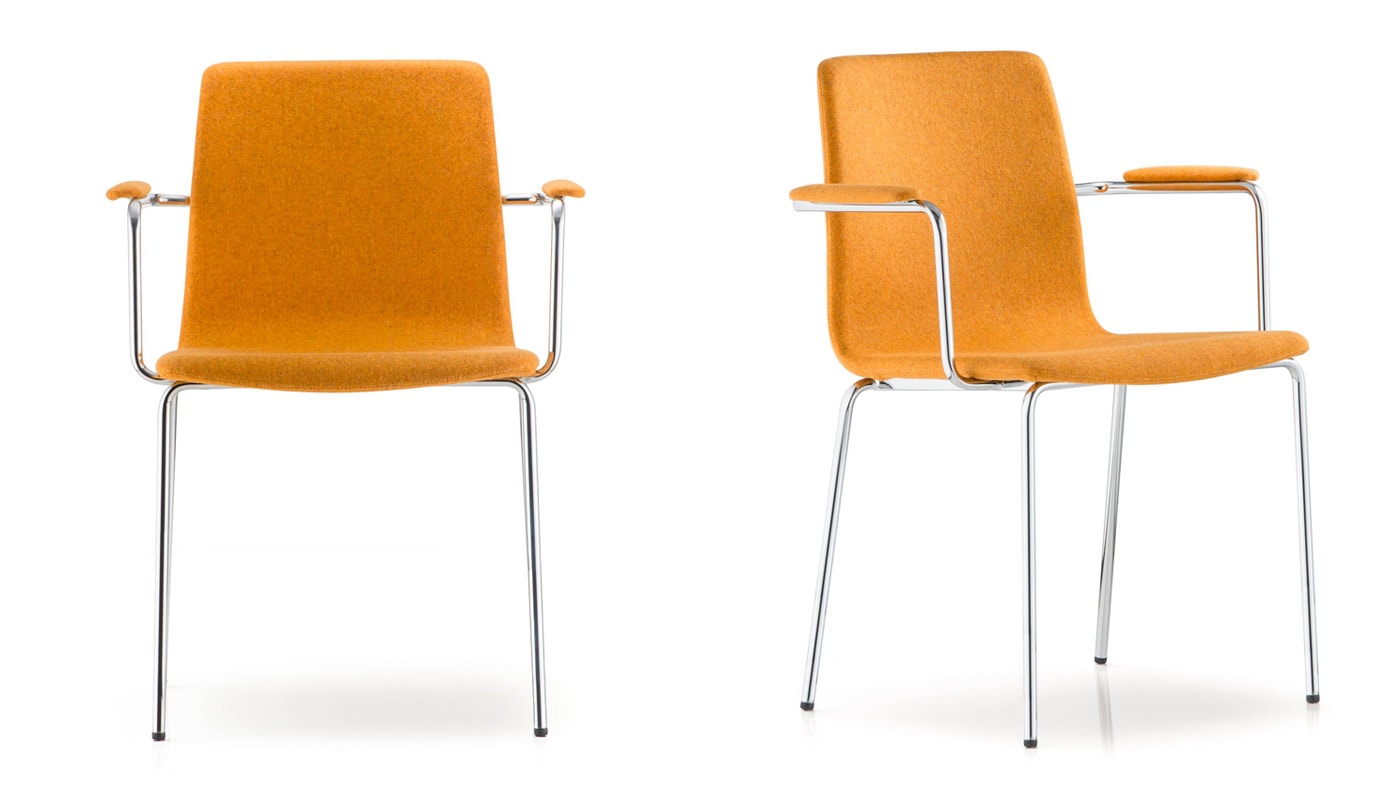 La scocca in multistrato di rovere impiallacciato poggia su una struttura in tubo d’acciaio Ø16 mm, disponibile in tre configurazioni: con quattro gambe, con o senza braccioli, oppure con base a slitta.