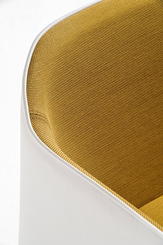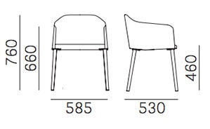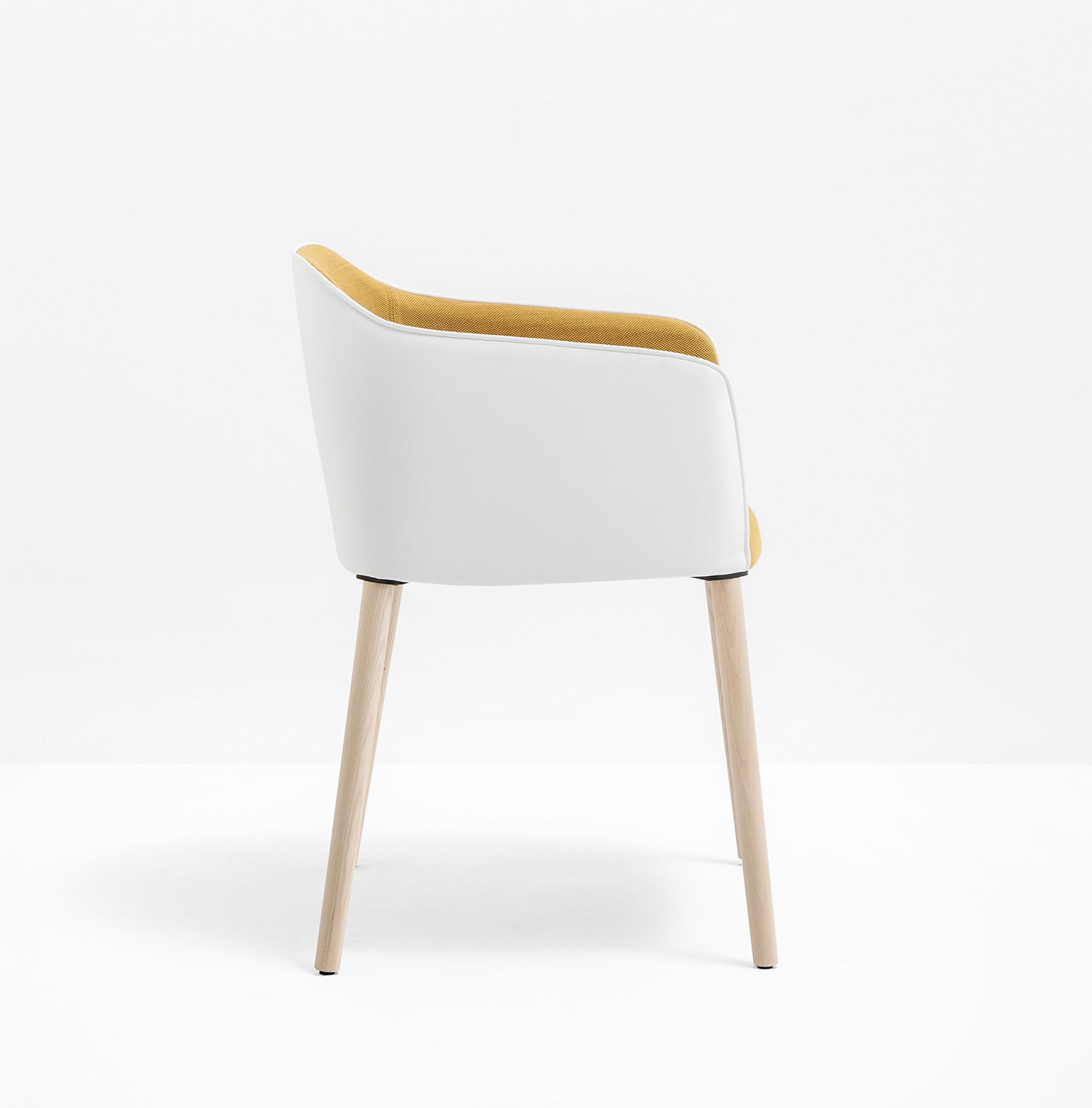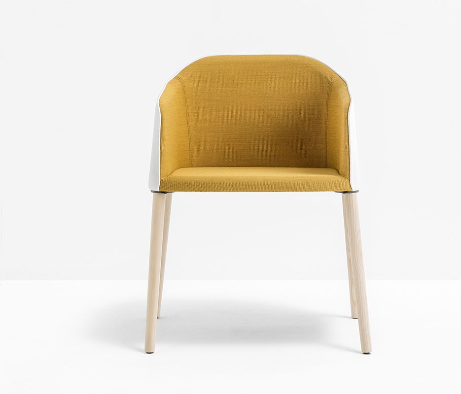 Un ampio guscio avvolgente poggia su quattro gambe in legno massello di frassino, disponibili nella versione sbiancata o tinta nera, conferendo alla seduta un carattere raffinato e versatile.