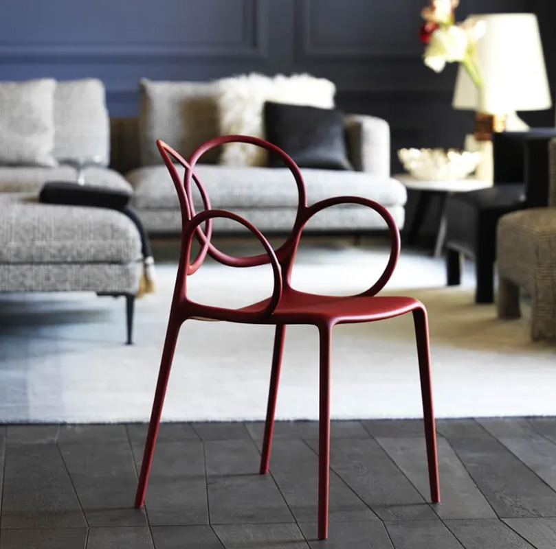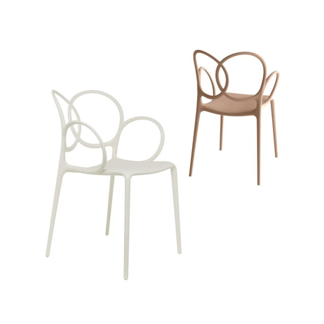 Curve viennesi che si intrecciano in modo inatteso, suggestioni classiche che rivivono in materiali squisitamente contemporanei, presenza scultorea, eleganza aristocratica e un tocco di innocente e frivola vanità: tutto questo è Sissi, poltroncina impilabile di Driade ideata da Ludovica e Roberto Palomba.