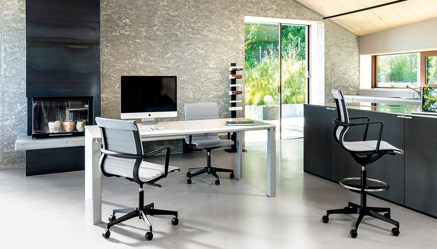 La versatilità della sedia Tekno la rende ideale come seduta ospiti per il front desk dell’ufficio, come sedia per sale riunioni e meeting, o in casa, nell’angolo adibito ad home office.