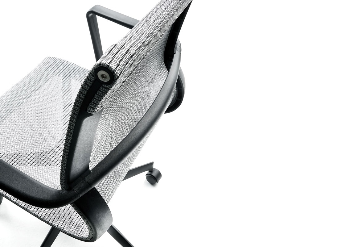 La sedia per ufficio Tekno di Della Chiara è presente a catalogo in due versioni: in rete elastica di vari colori oppure tappezzata in tessuto bielastico Trevira CS in poliestere.