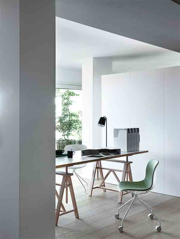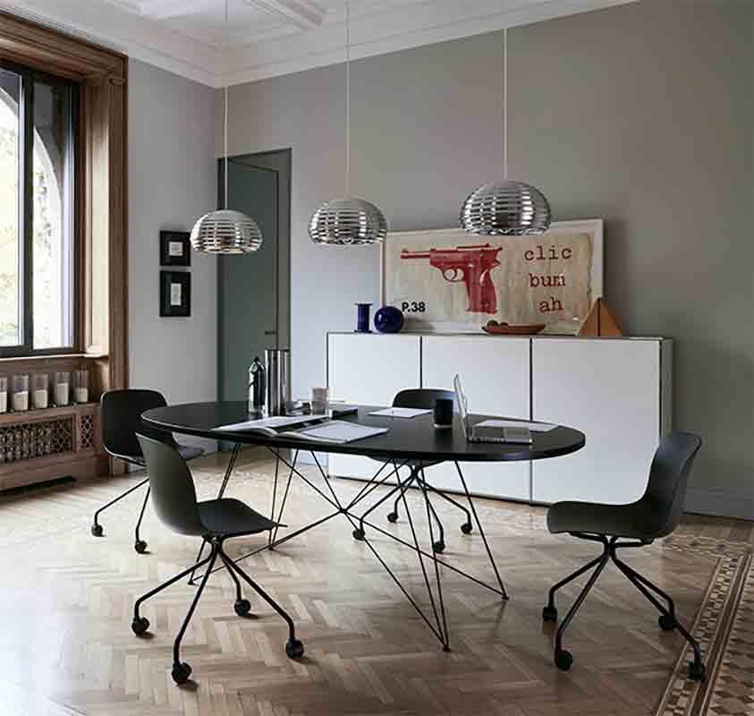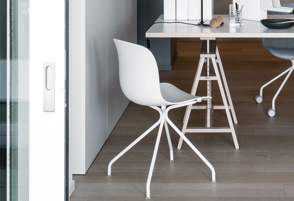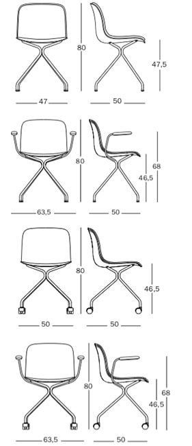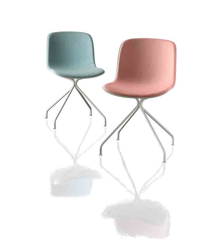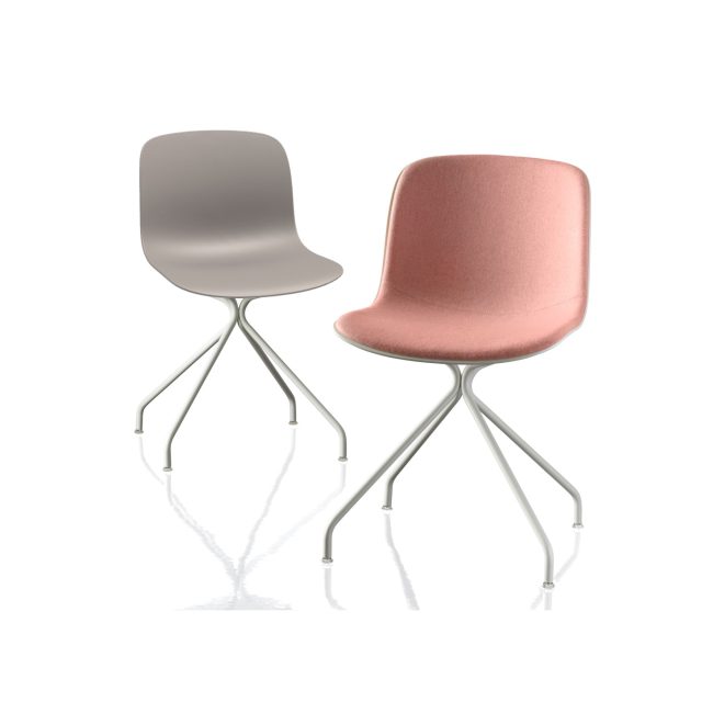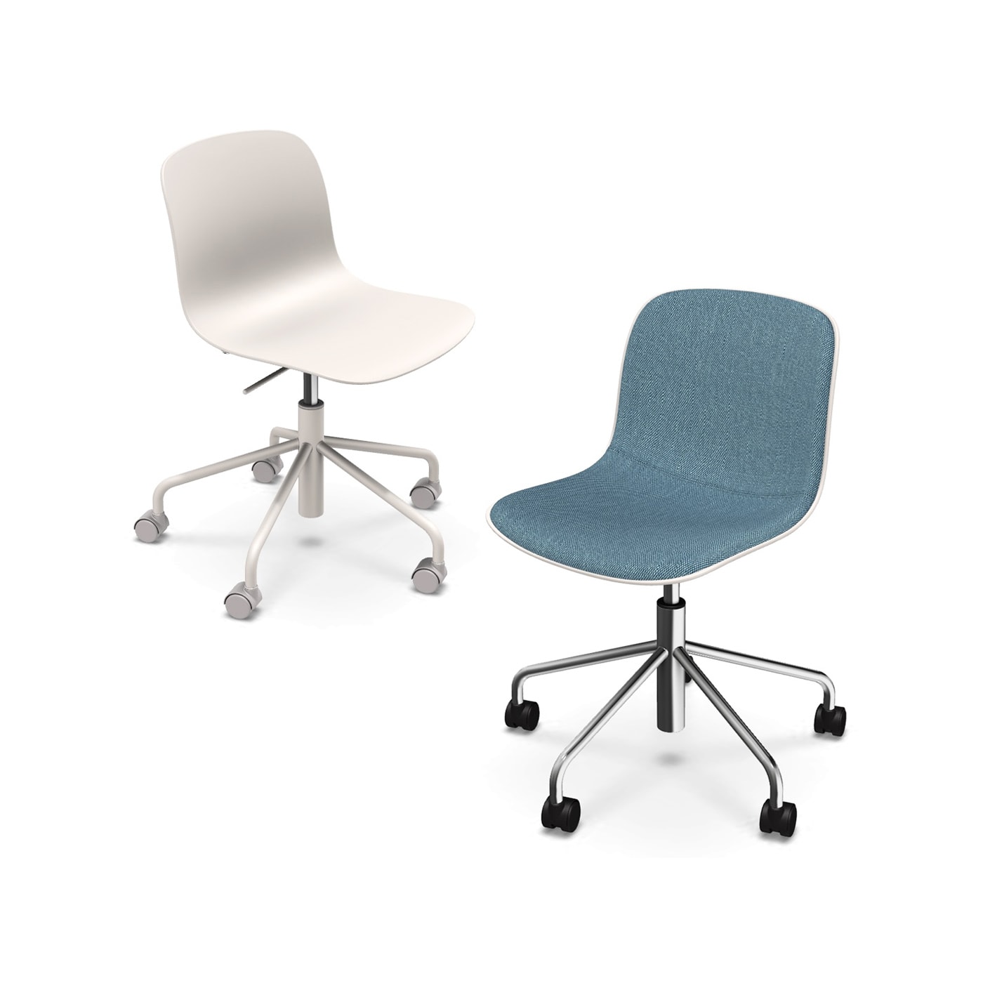 La base in acciaio a quattro razze, disponibile su piedini o ruote, sostiene un sedile proposto in un’ampia gamma di materiali e finiture, compresi modelli imbottiti e rivestiti in tessuto o pelle.