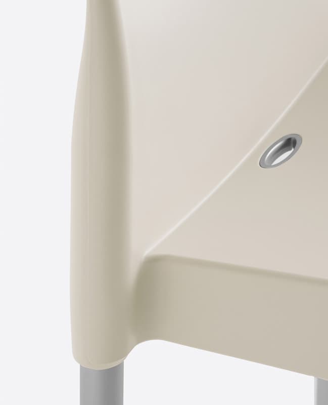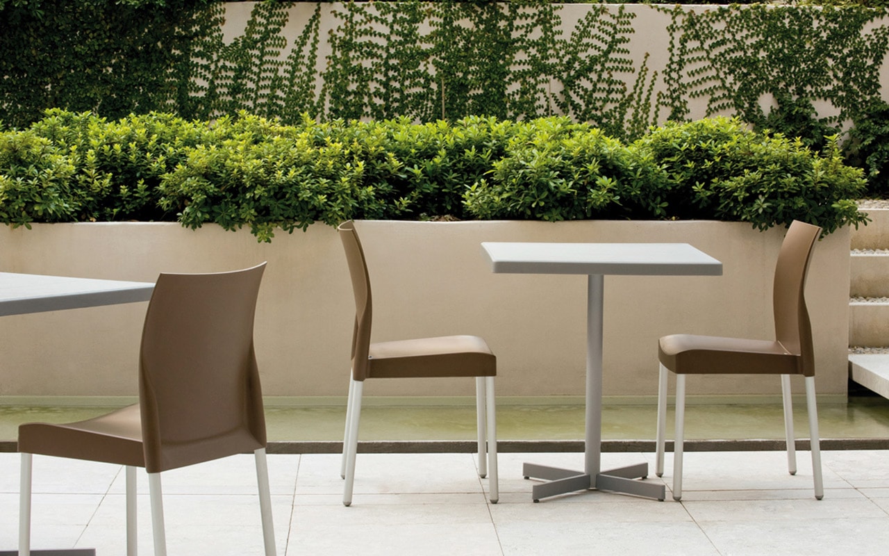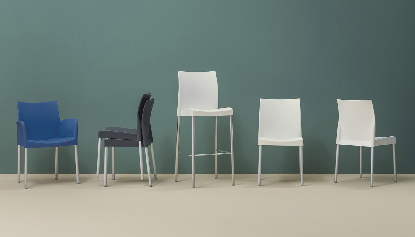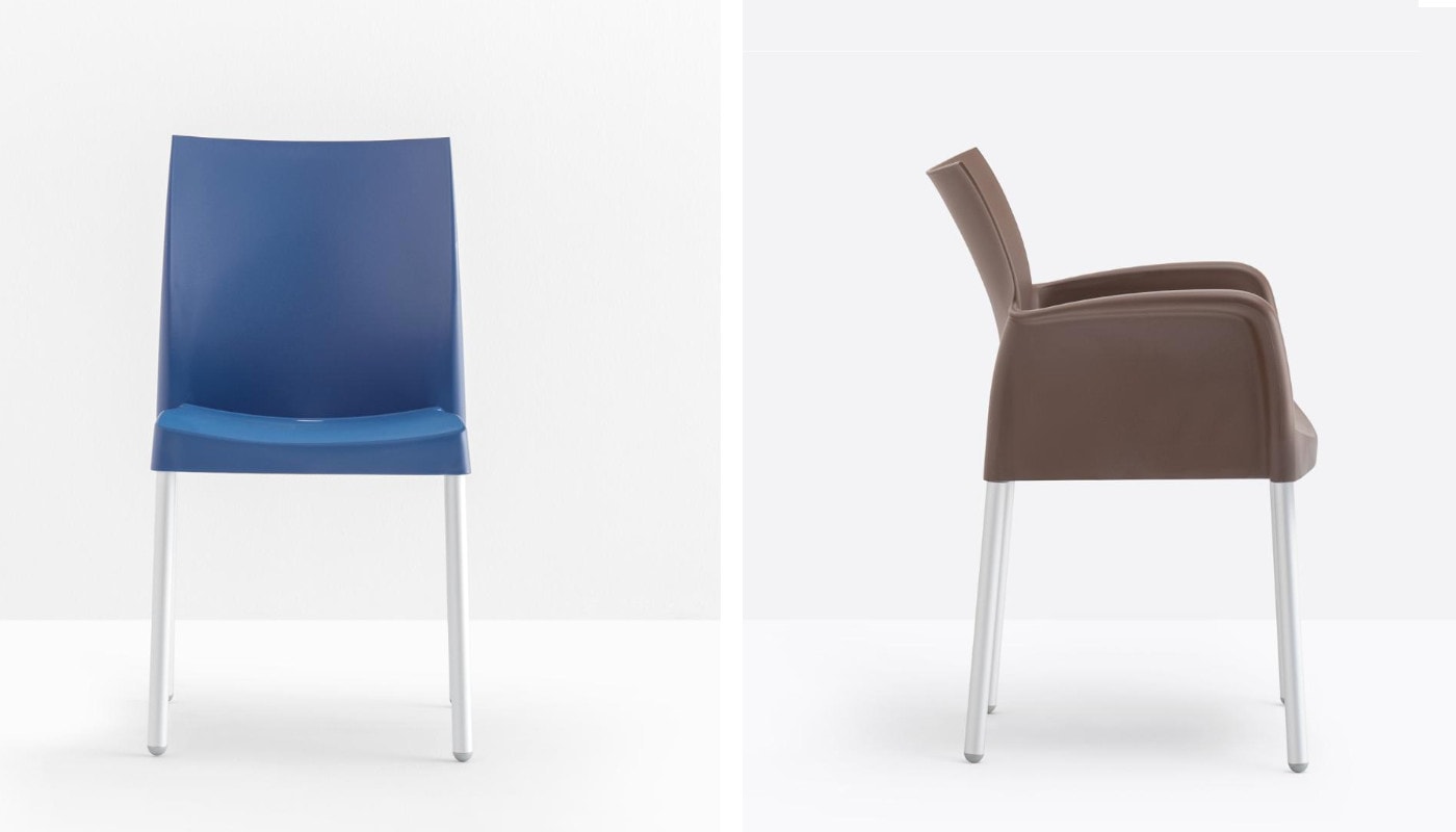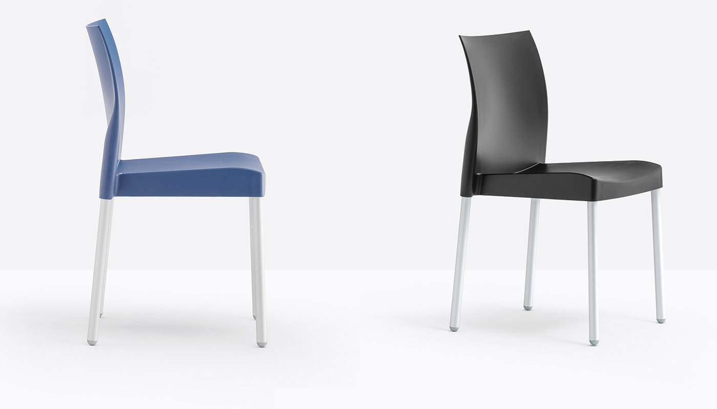 Design moderno e rigoroso per Ice 800 di Pedrali, sedia impilabile adatta anche agli esterni, con la scocca in polipropilene e le gambe in tubo d’alluminio anodizzato.