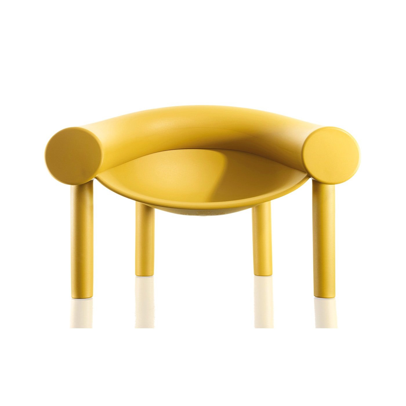 Realizzata in materiale plastico stampato in rotazionale, la poltroncina bassa Sam Son di Magis combina due tipi di polimero: uno più rigido per la base, che garantisce stabilità e resistenza, e uno più elastico per lo schienale e i braccioli, che accolgono l’utente in un morbido abbraccio ergonomico.