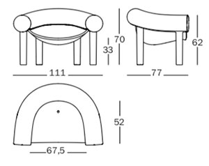 L’elemento ad arco, che ricorda un tubolare a ferro di cavallo, funge da schienale e braccioli, evocando con umorismo un’estetica quasi cartoonistica, ma con soluzioni tecniche di alto livello.
