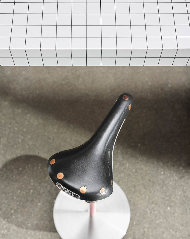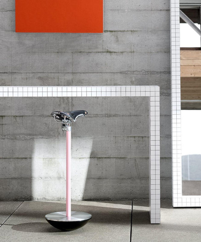 Con un’altezza di settantun centimetri, Sella presenta un robusto basamento in fusione di ghisa e una seduta che è un autentico sellino da ciclista.