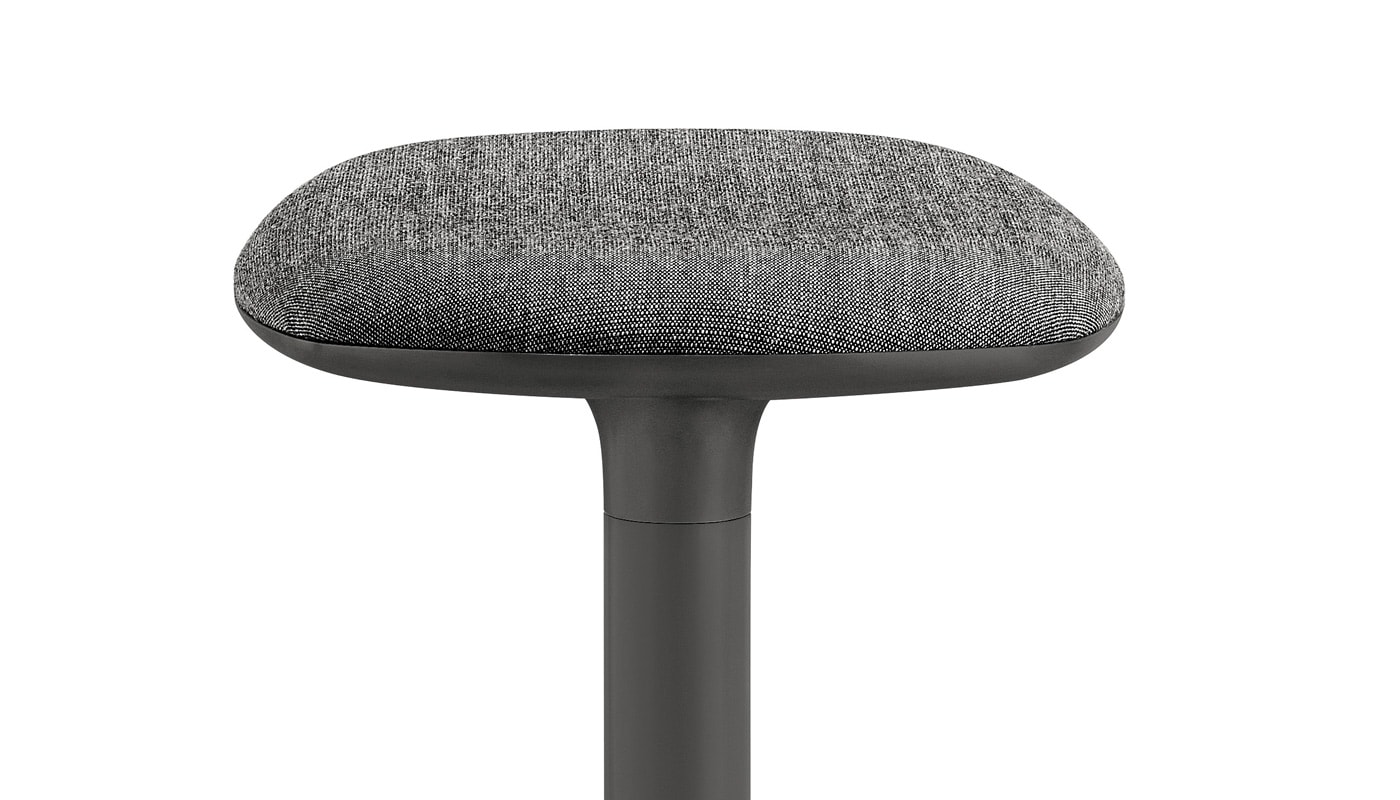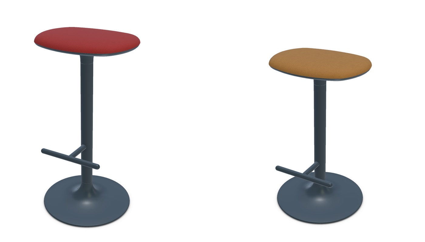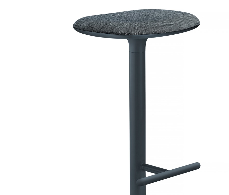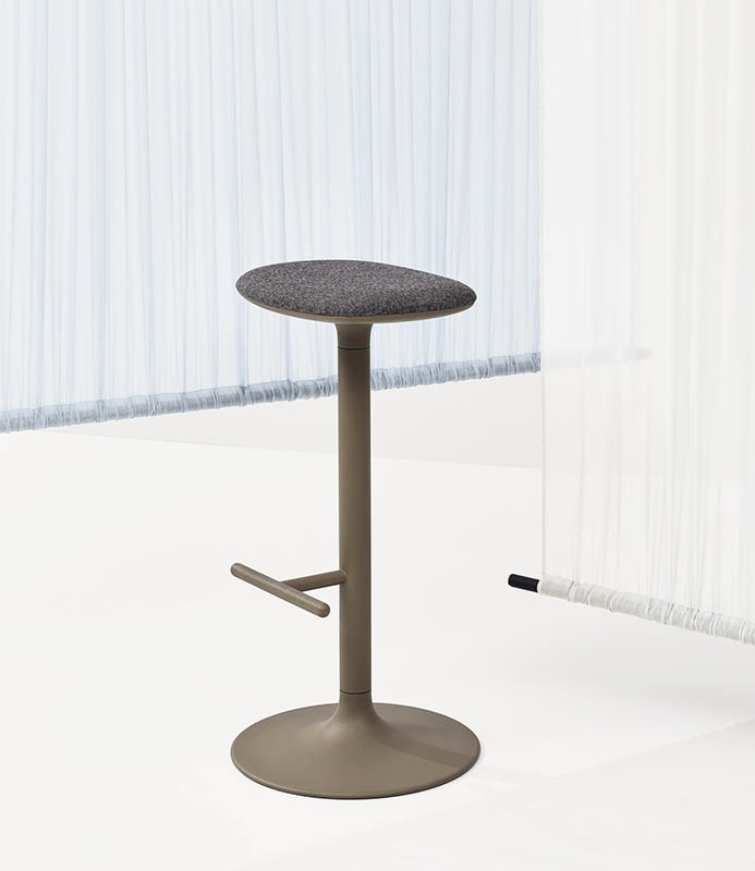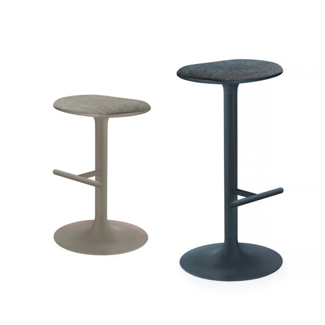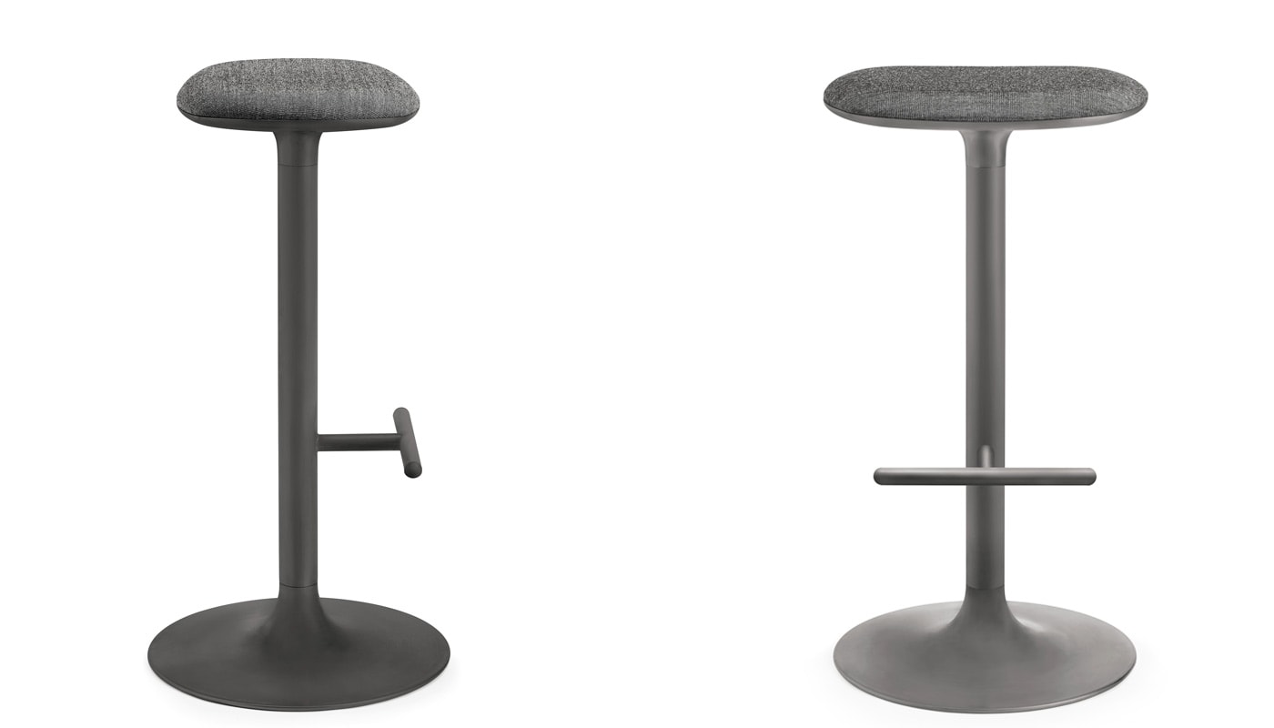 L’attenzione al dettaglio si rivela nella sua apparenza semplice: base e stelo in acciaio verniciato con poggiapiedi sostengono la seduta, che ha supporto in acciaio con pannello multistrato, imbottito e rivestito in molteplici tessuti, pelle o ecopelle.