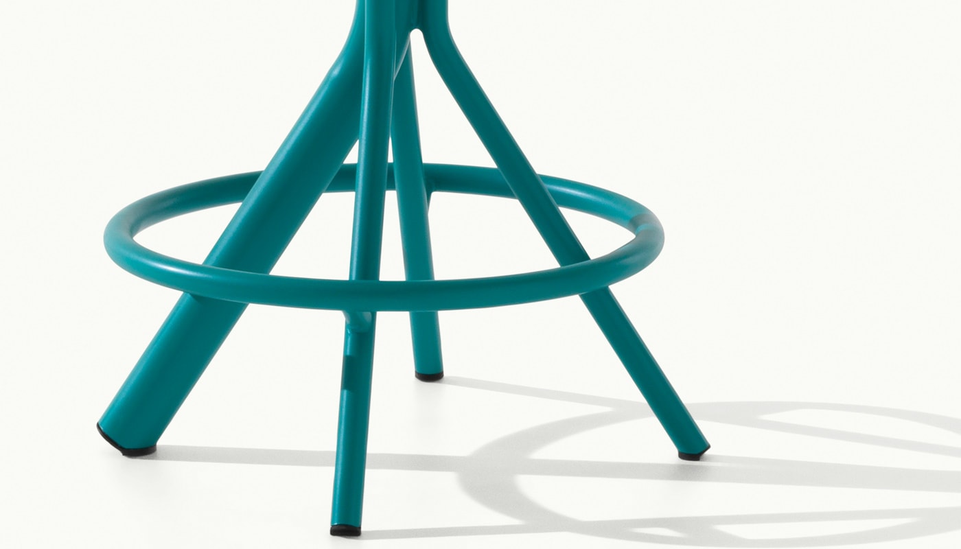 Il telaio centrale in tubolare metallico sostiene il sedile girevole in legno dello sgabello e scende a terra piegandosi su un lato per diventare punto di appoggio, mentre le altre gambe in acciaio risalendo lo accostano lateralmente.