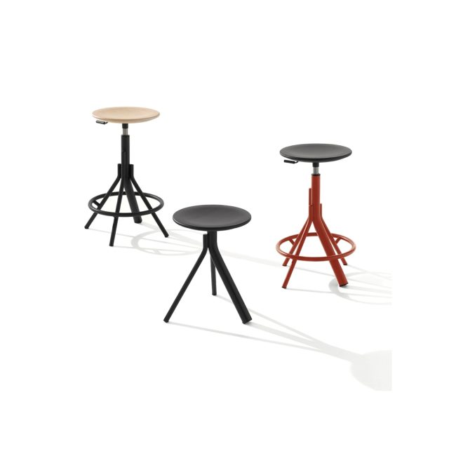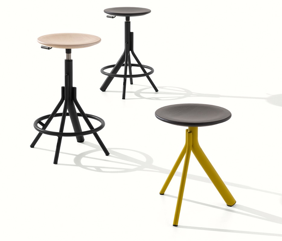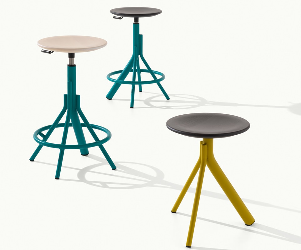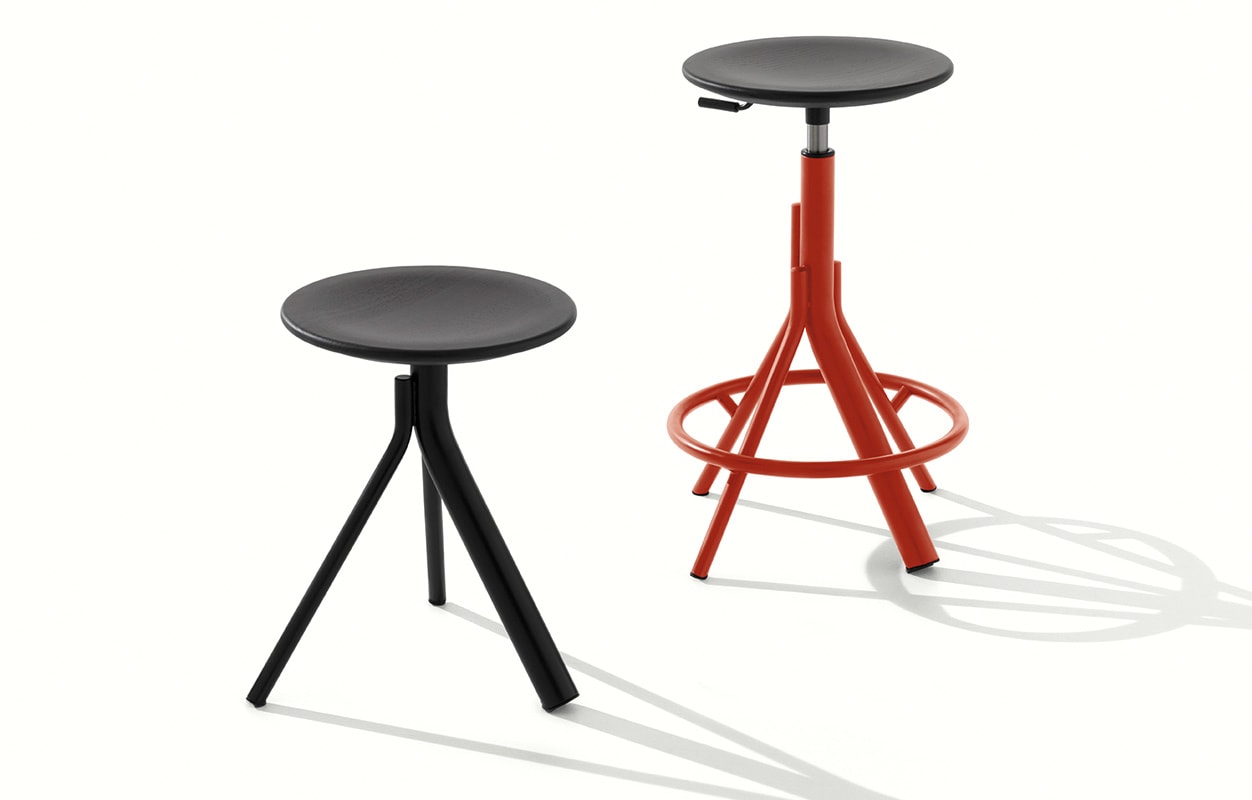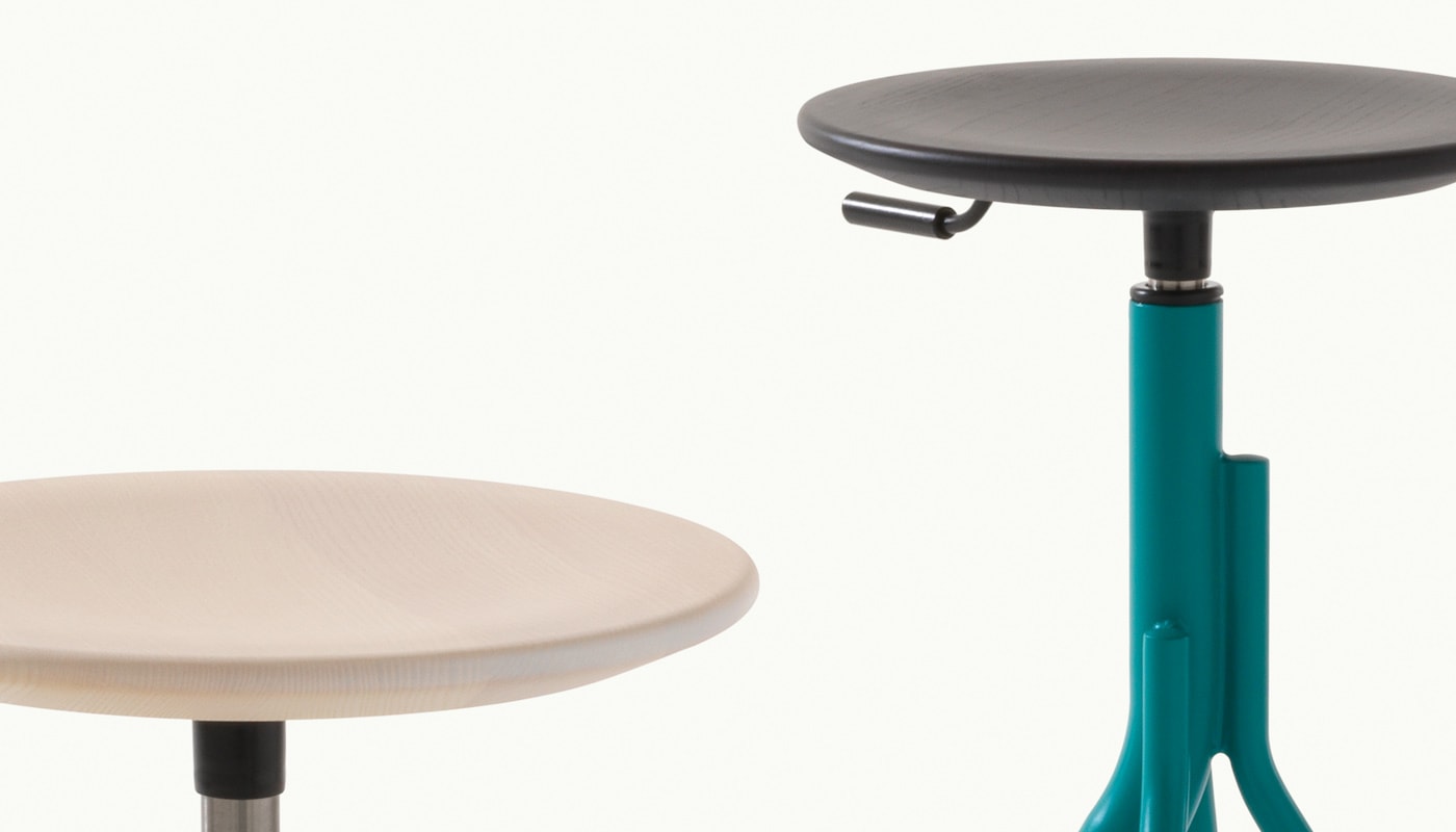 Lo sgabello girevole Main di Et al. disegnato da Lorenzo Damiani è una riedizione della classica seduta da tecnigrafo.